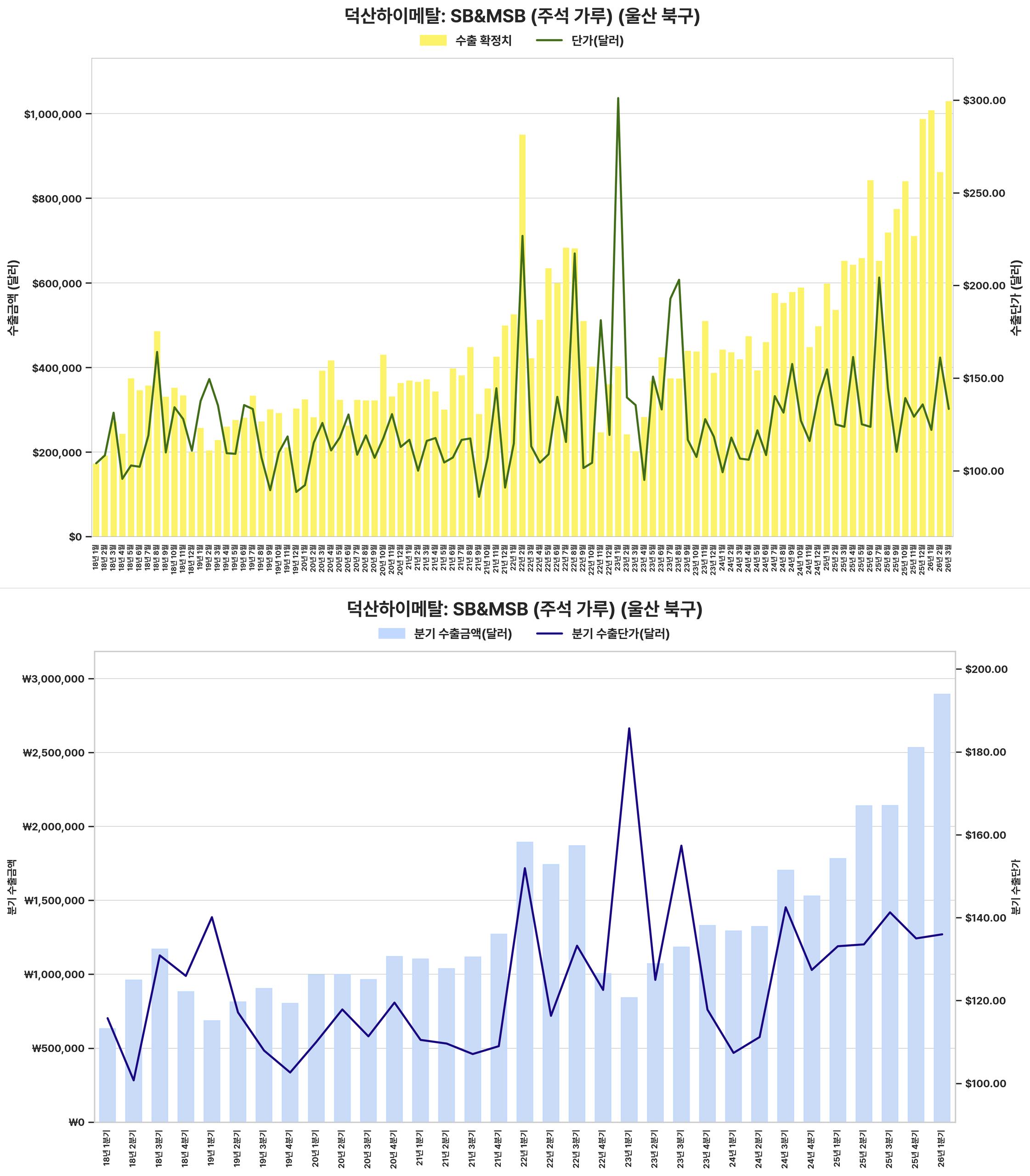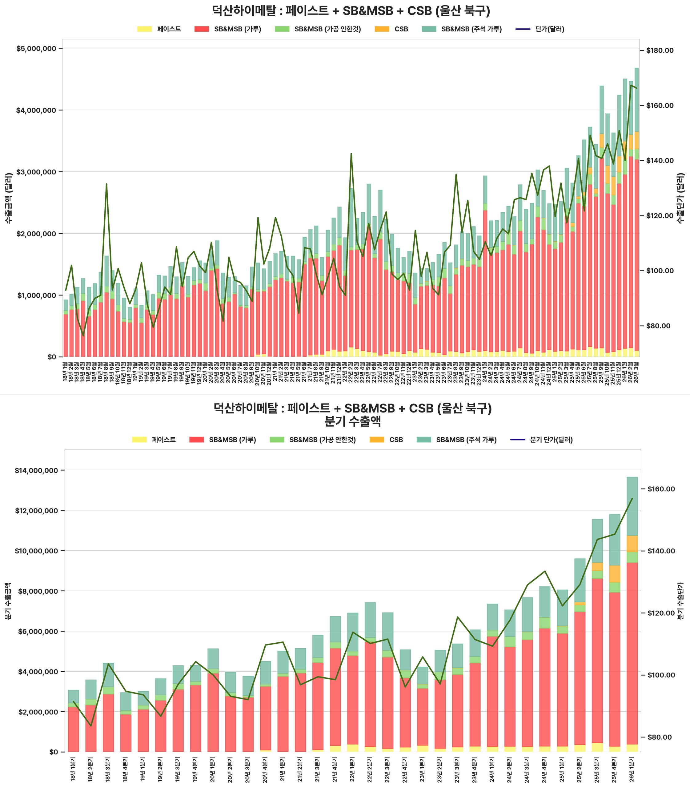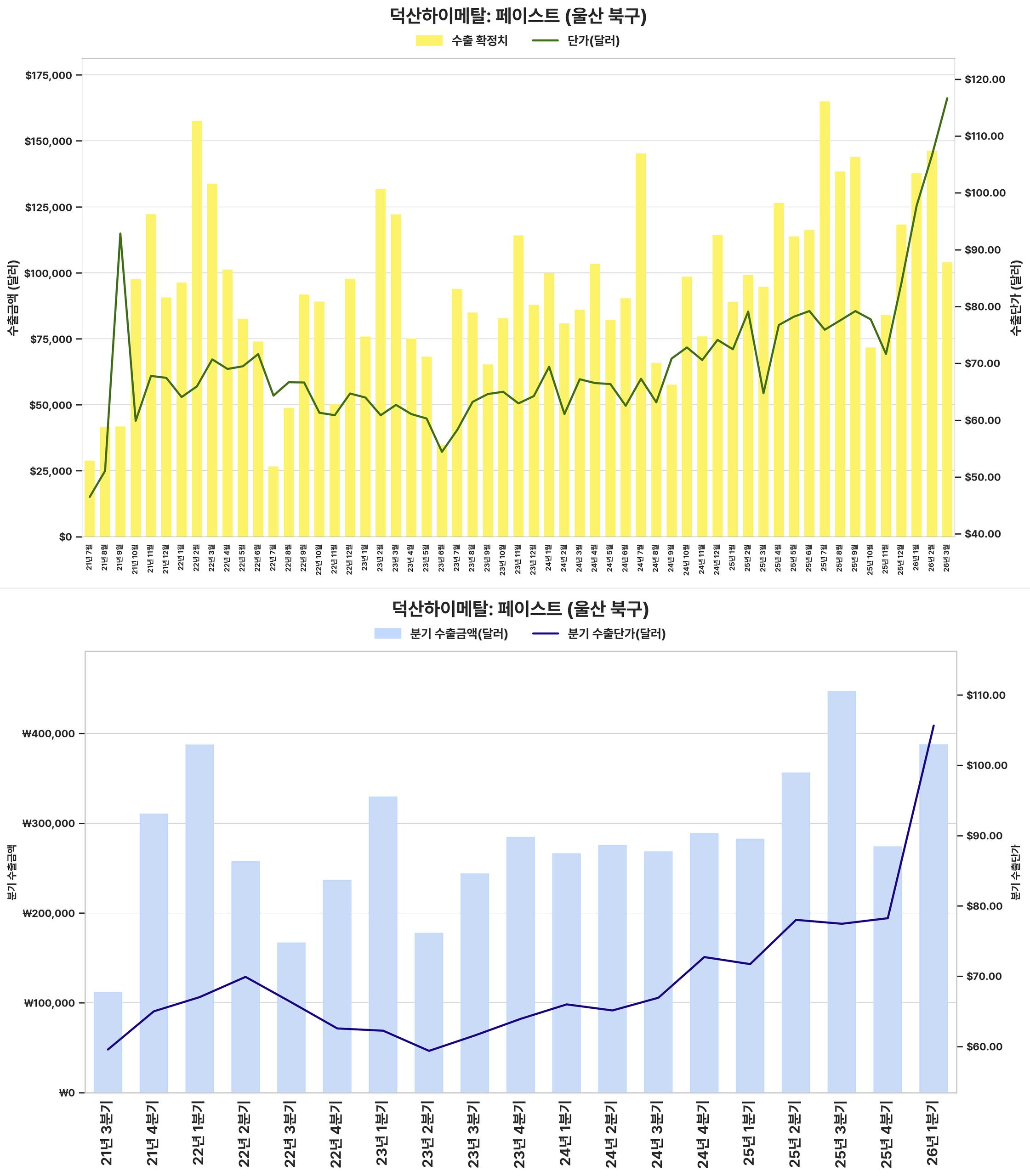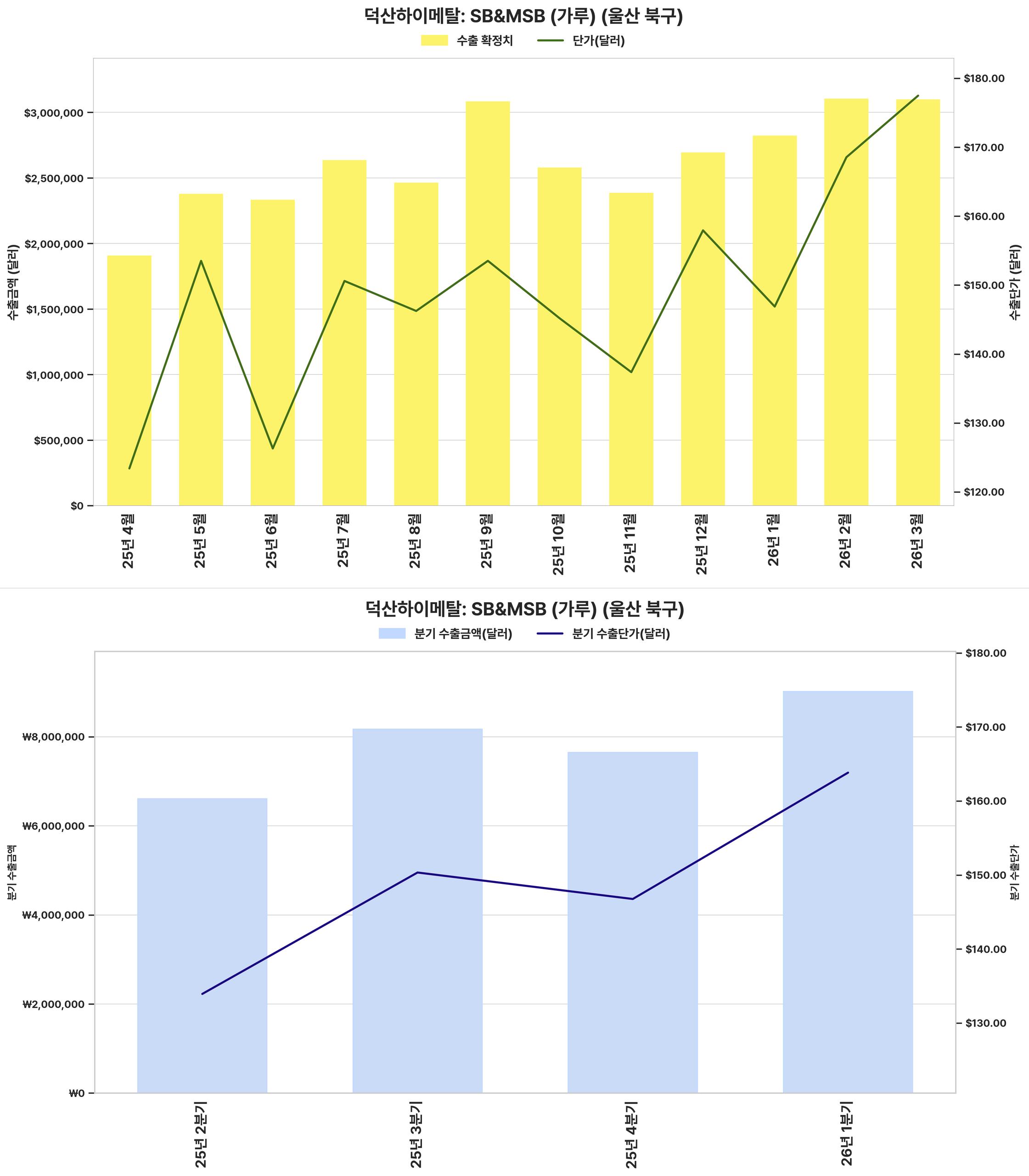 최근 분기 수출 금액과 단가가 크게 상승하여 전반적인 수출 실적이 견조하게 회복되었습니다.