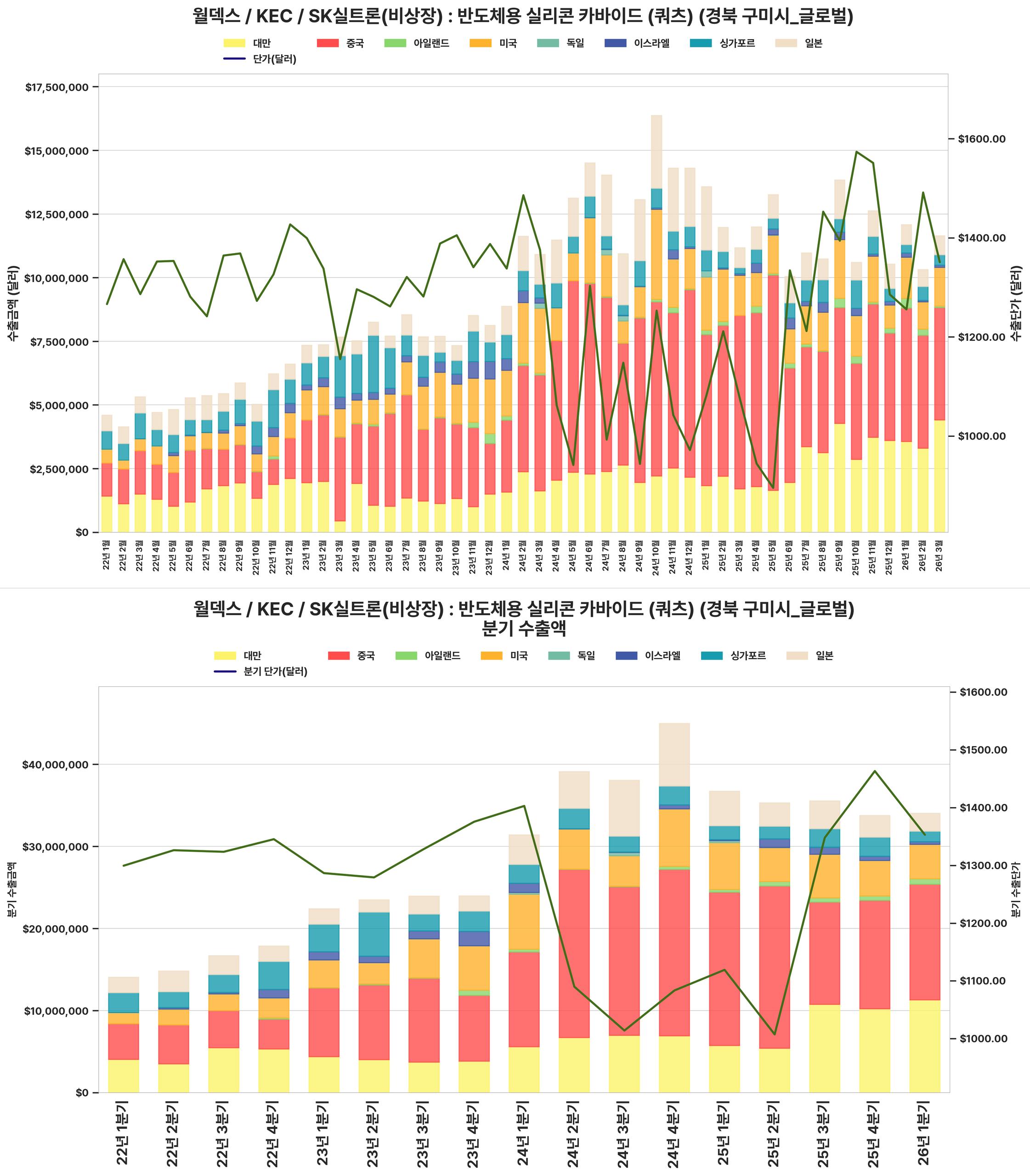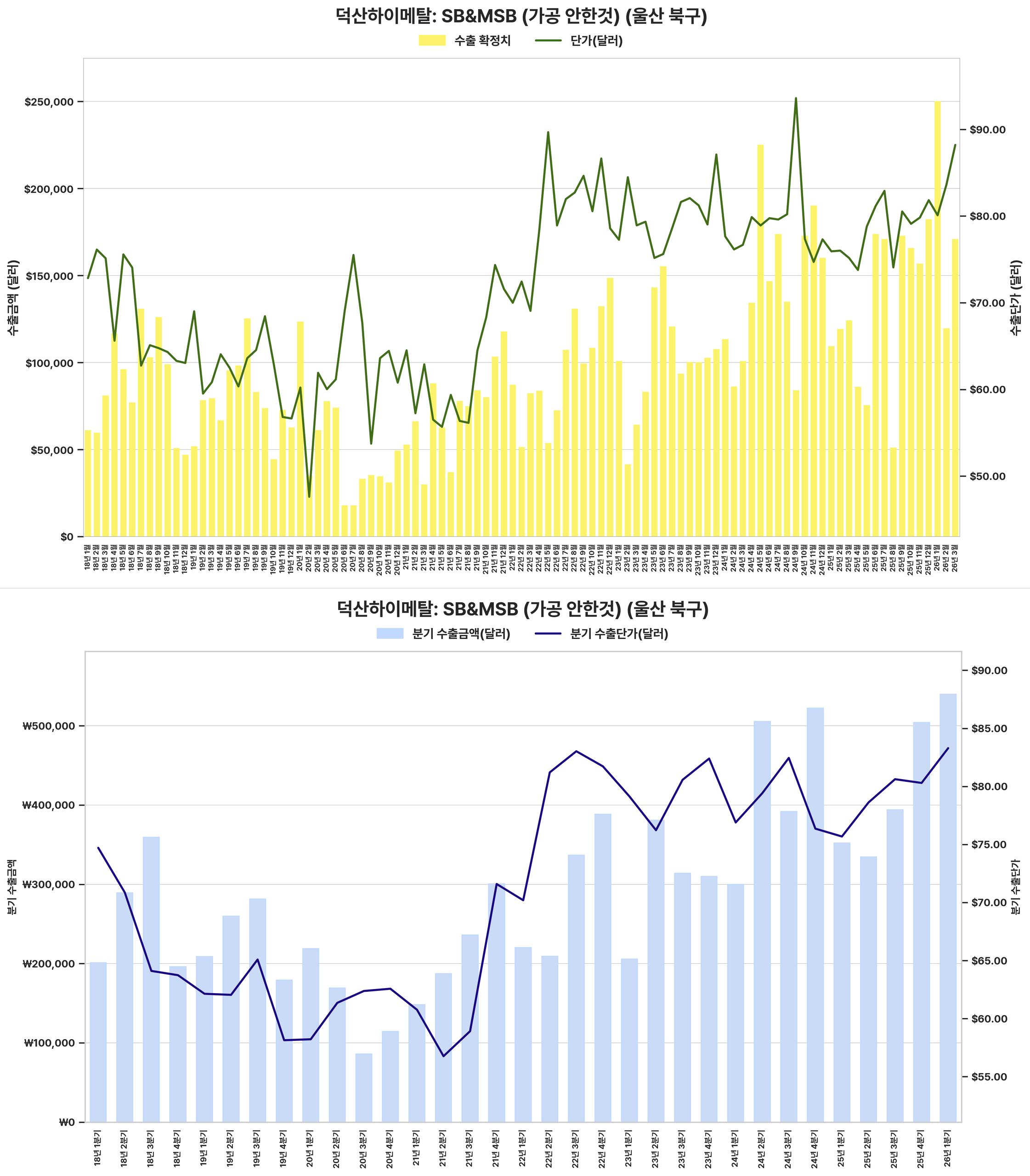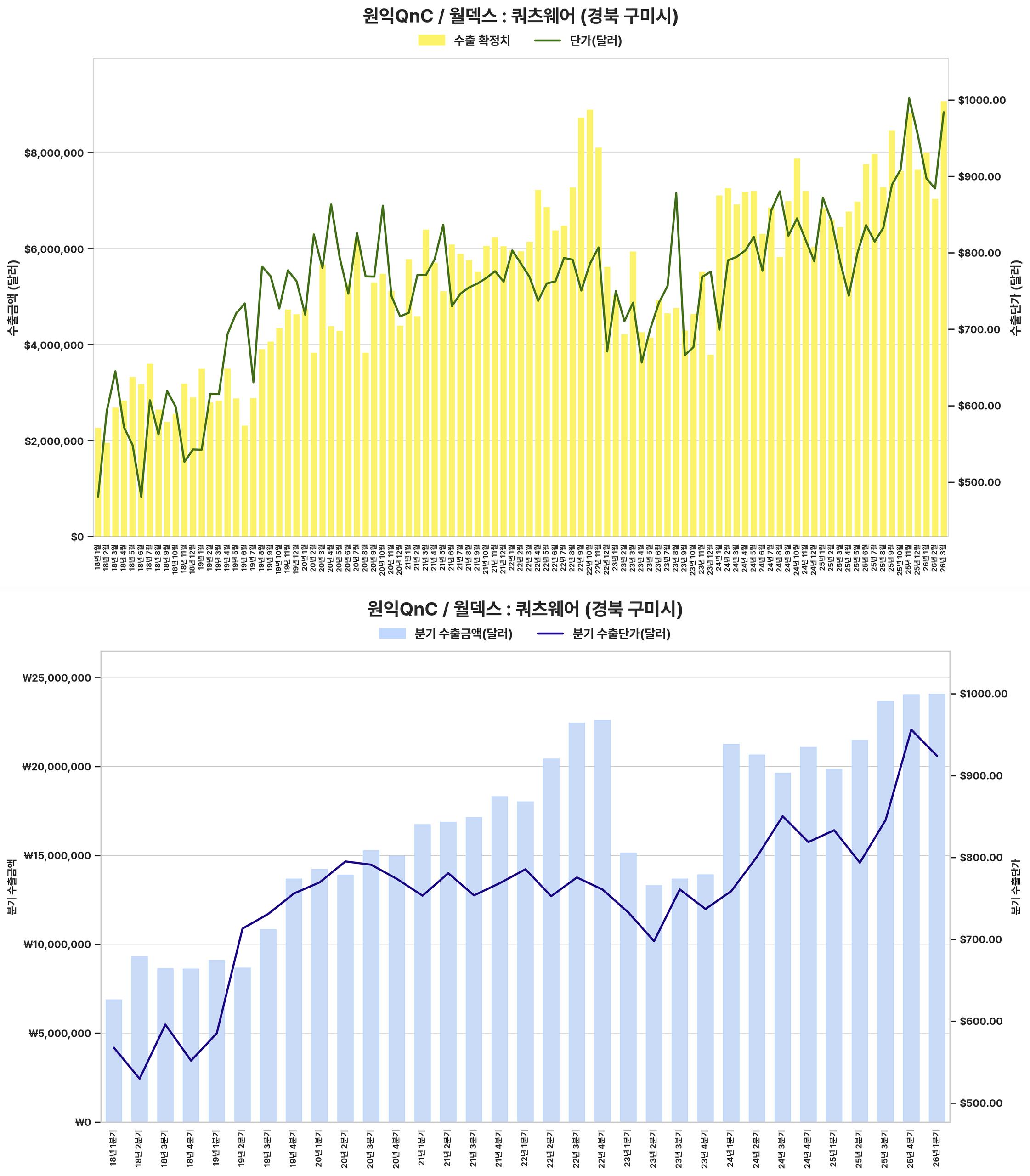 최근 분기 수출 금액과 단가가 크게 상승하여 전반적인 수출 실적이 견조하게 회복되었습니다.