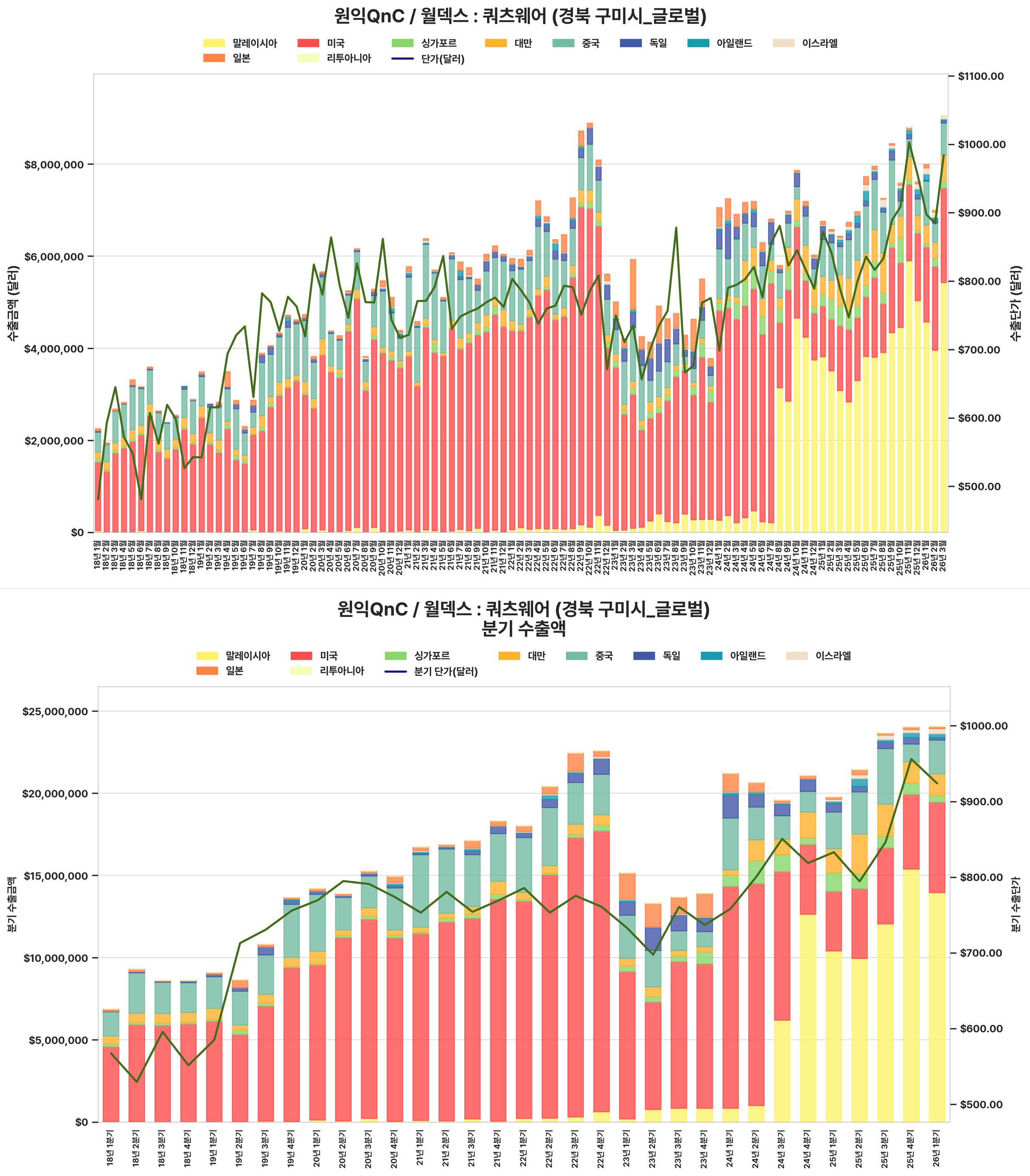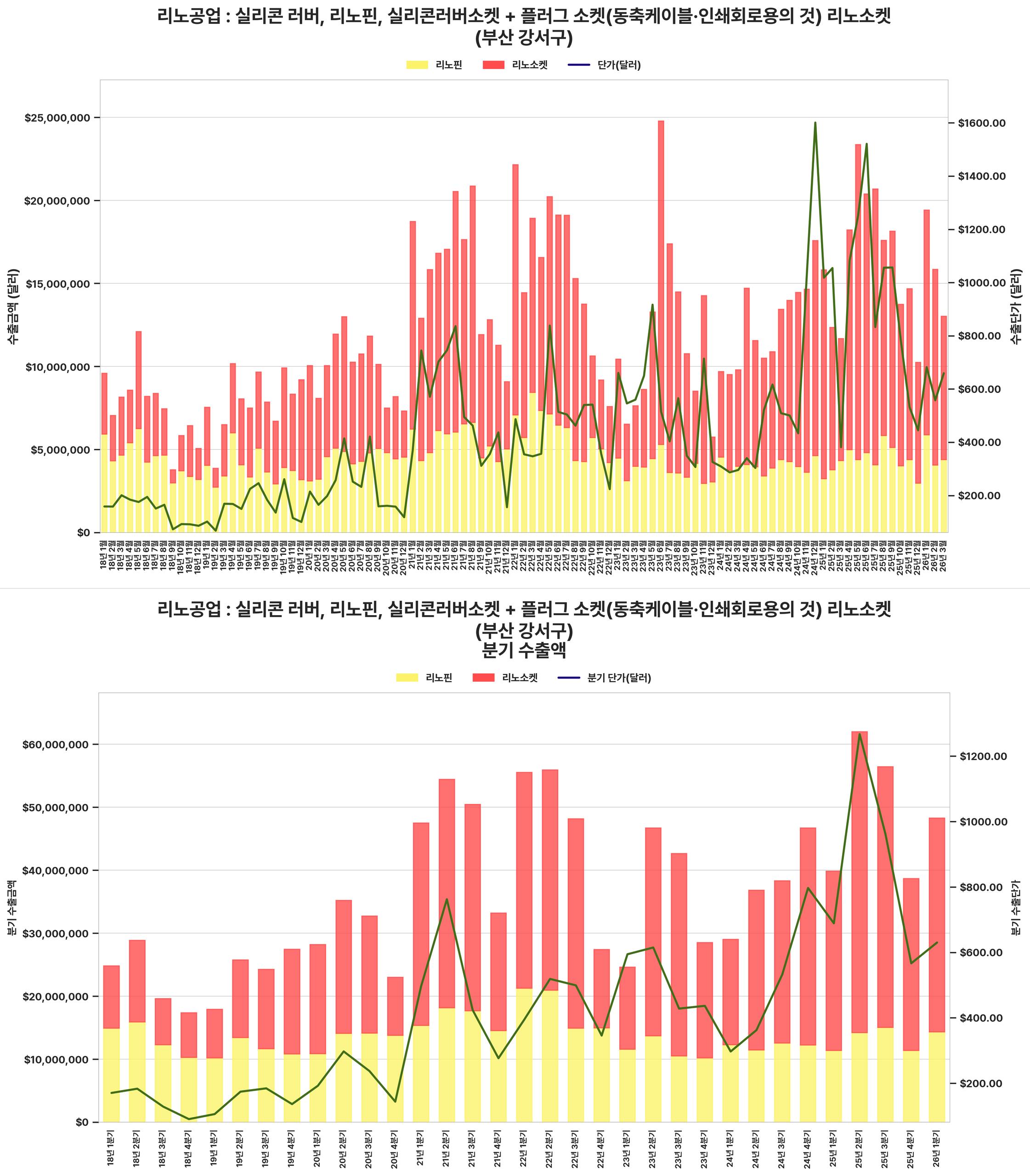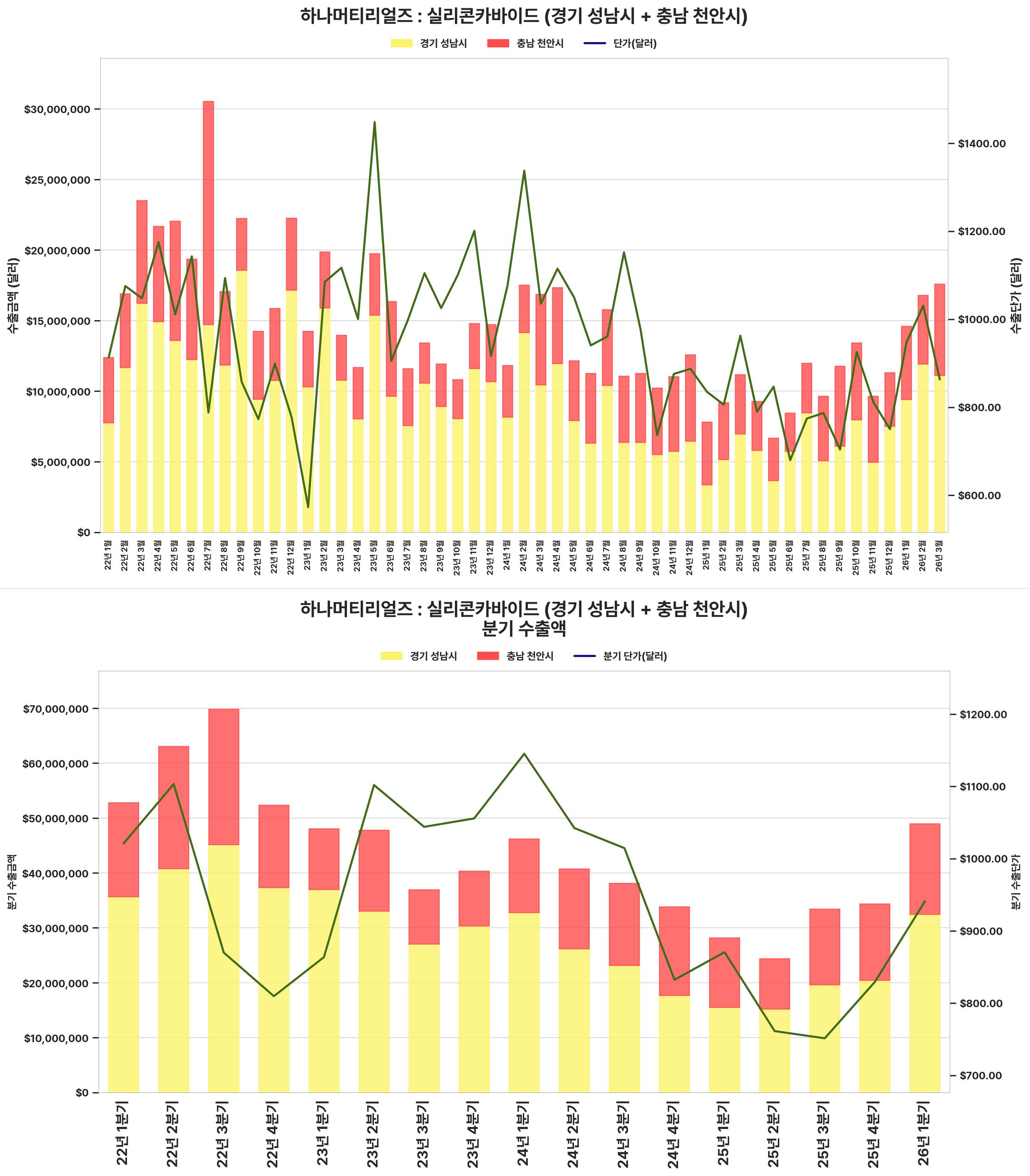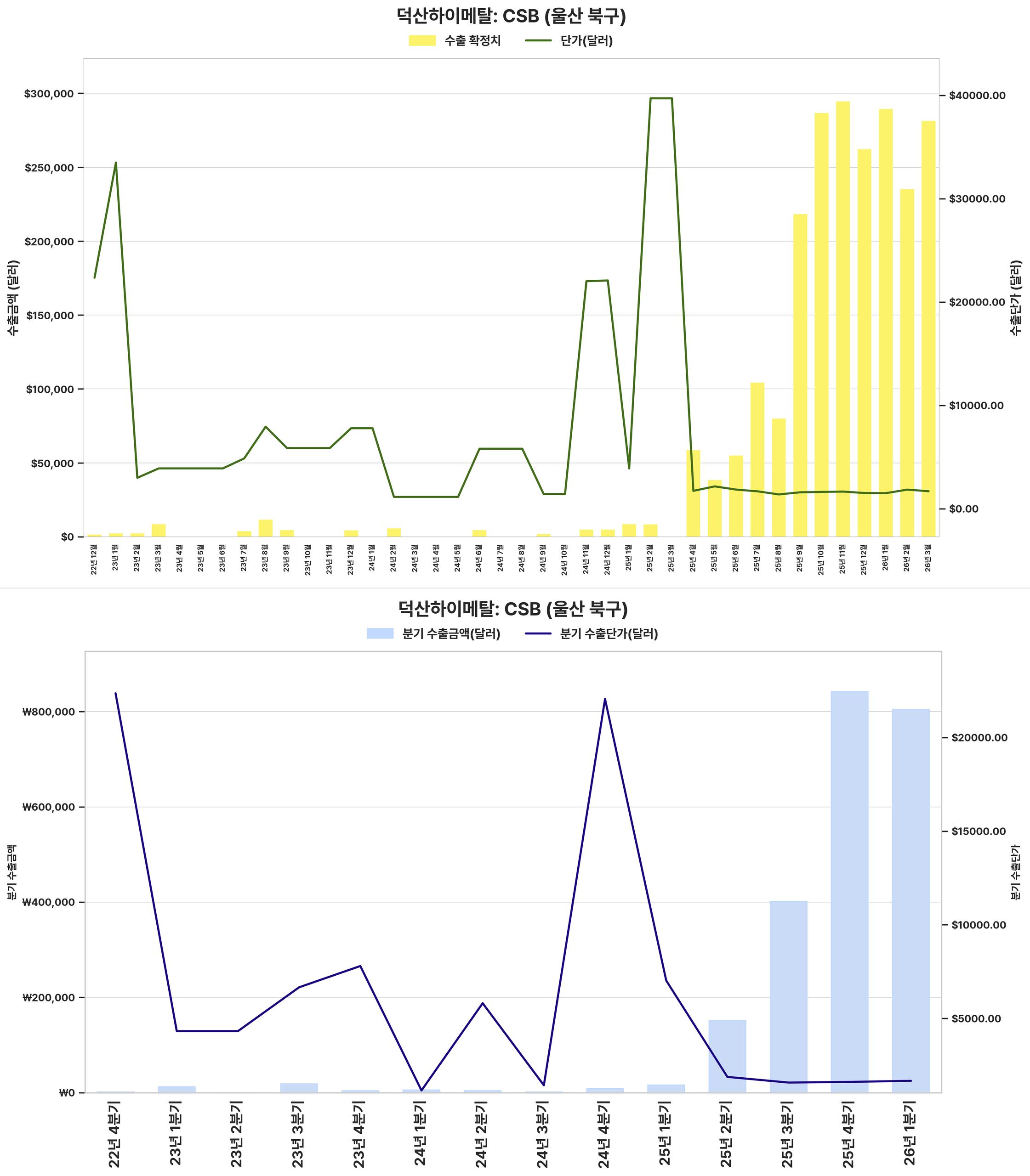 최근 분기 수출 금액과 단가가 크게 상승하여 전반적인 수출 실적이 견조하게 회복되었습니다.