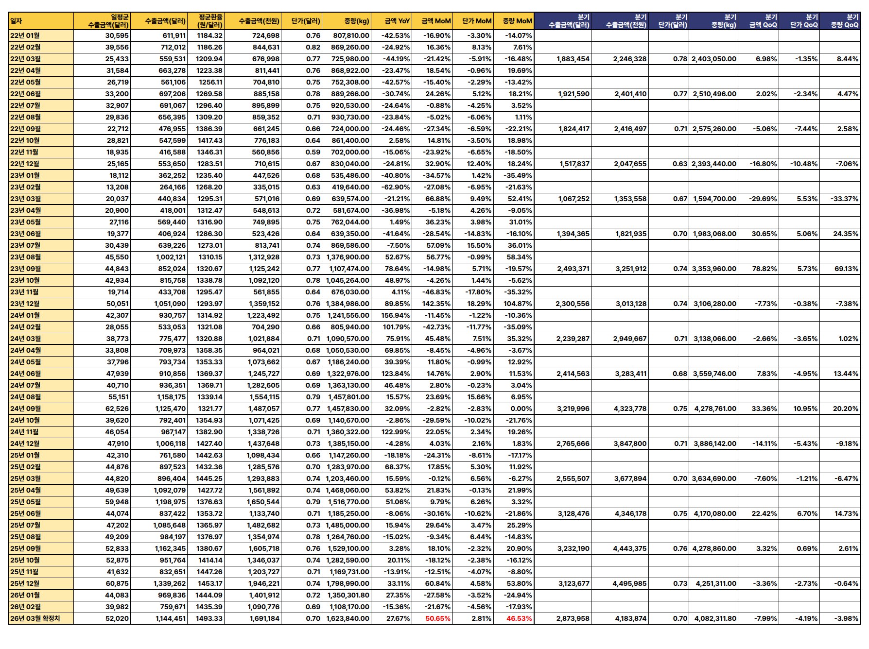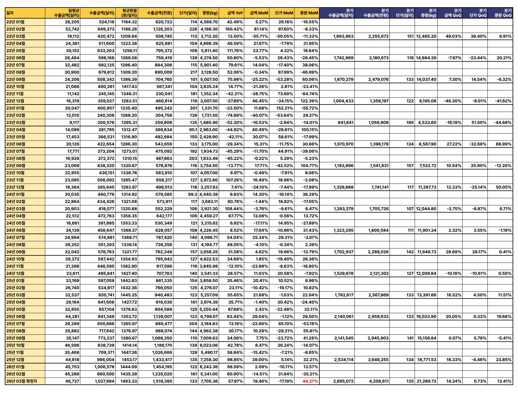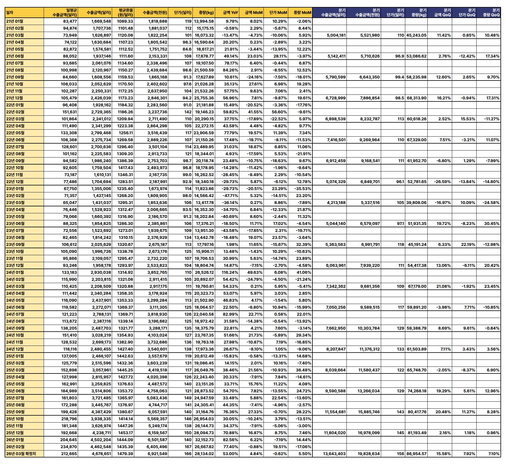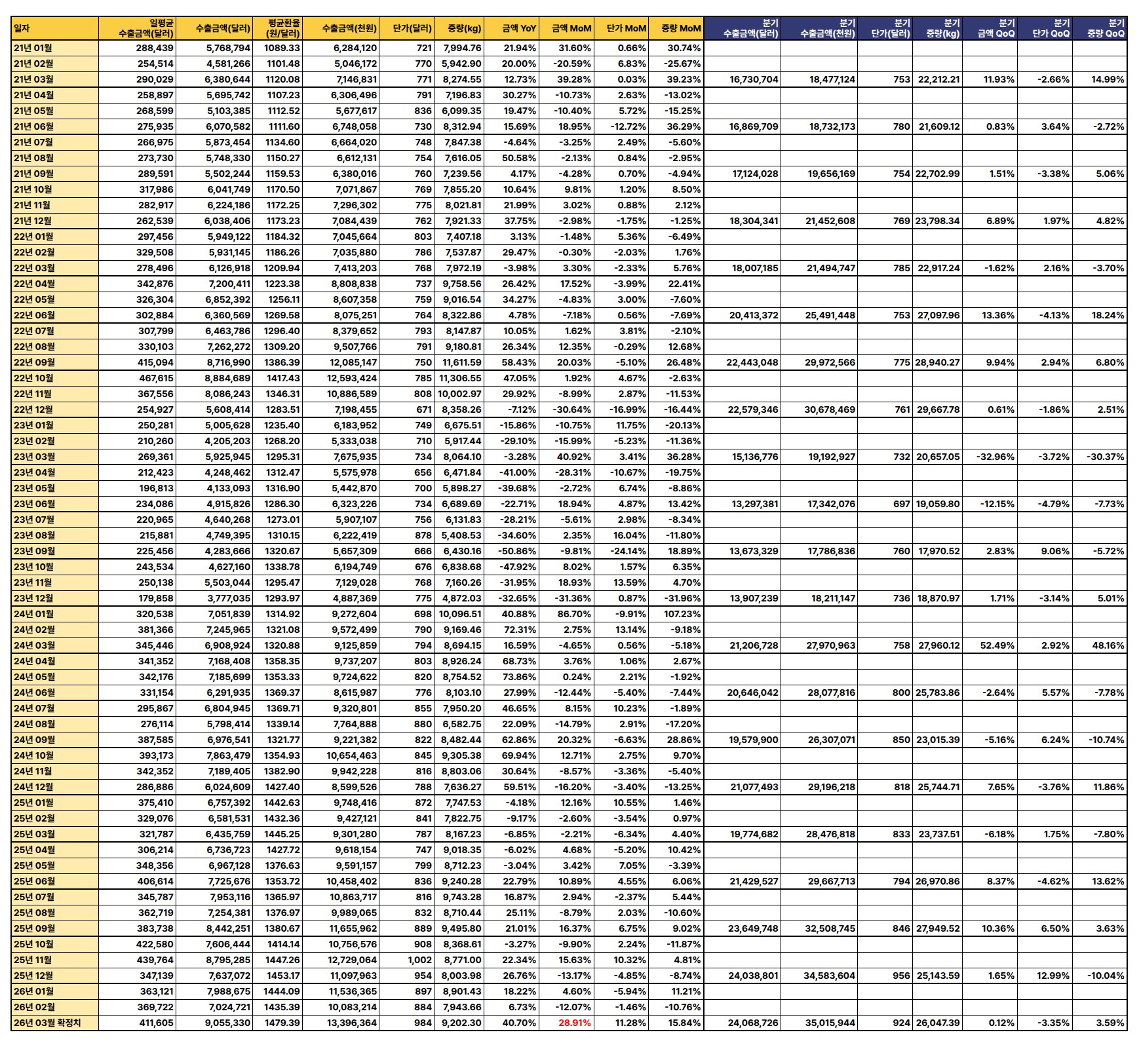 최신 수출 데이터(2026년 3월 확정치 기준)에 따르면, 수출 금액과 중량은 전월 및 전년 대비 증가세를 보이나 단가는 하락하여 전반적으로 혼조세를 나타냄.
