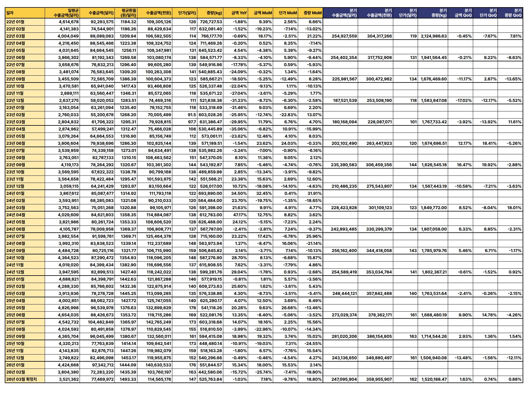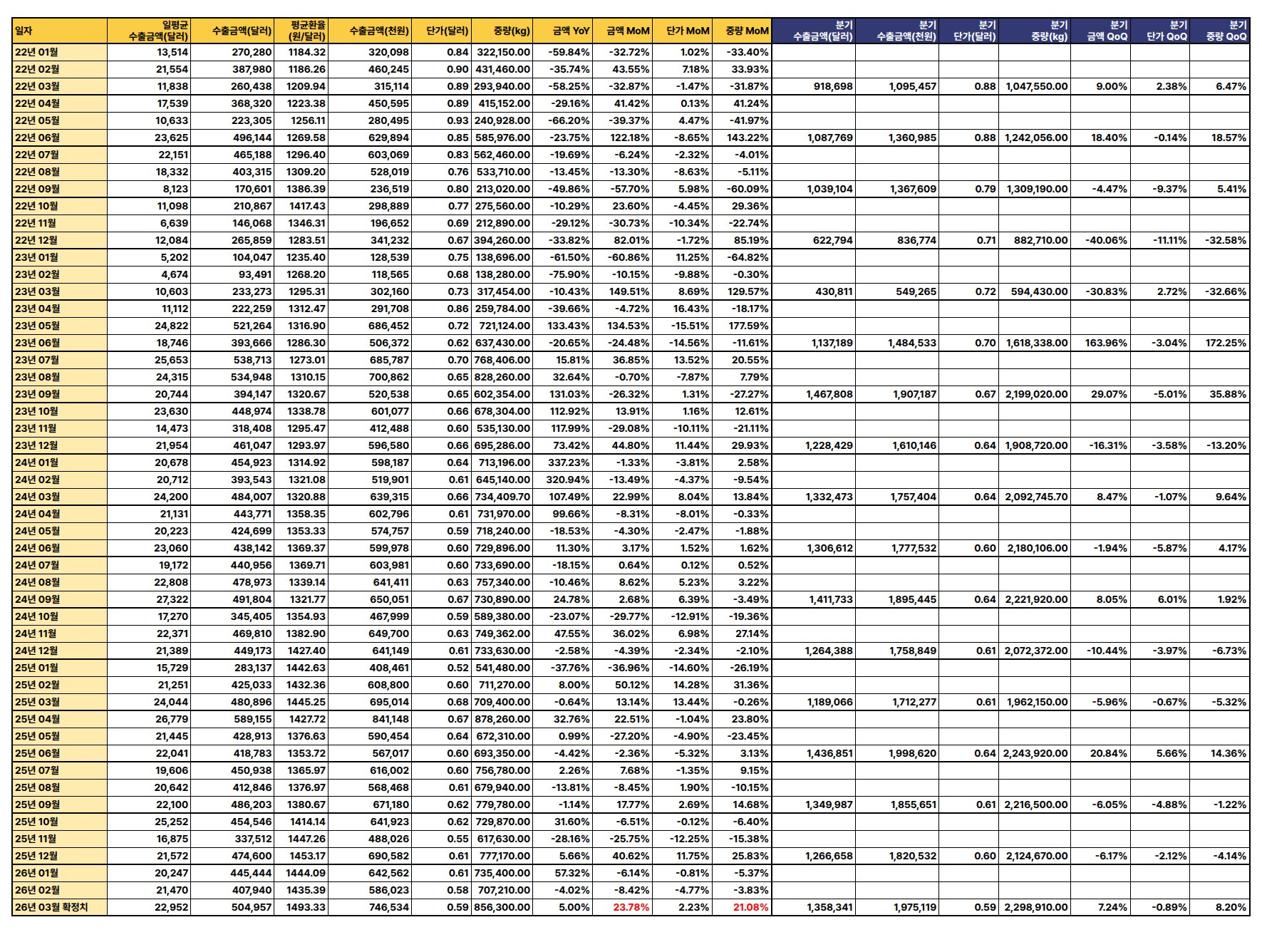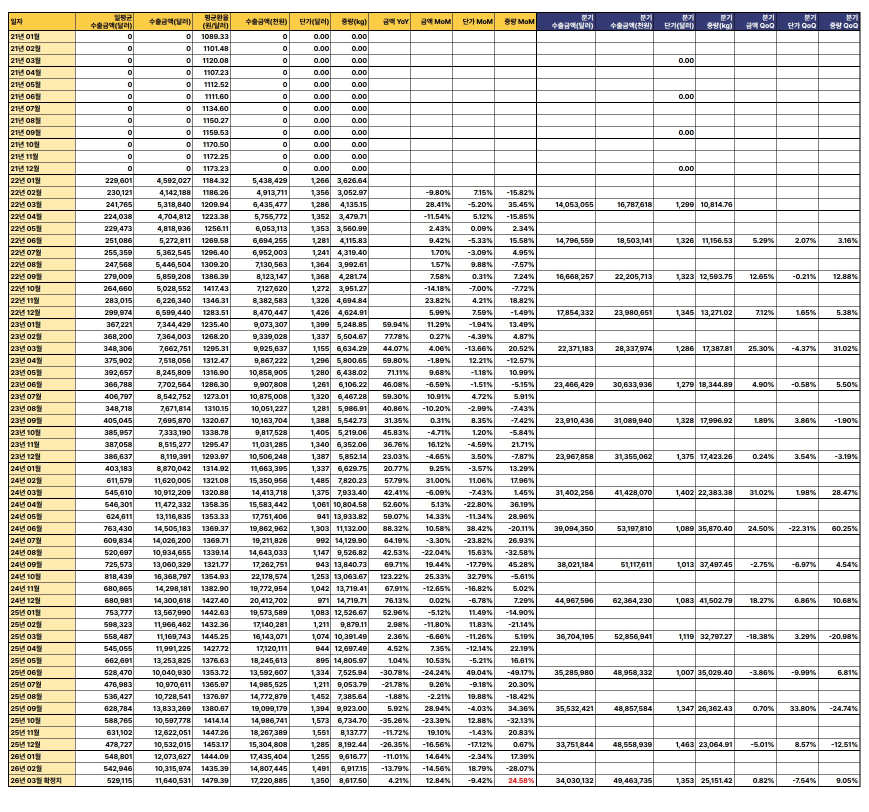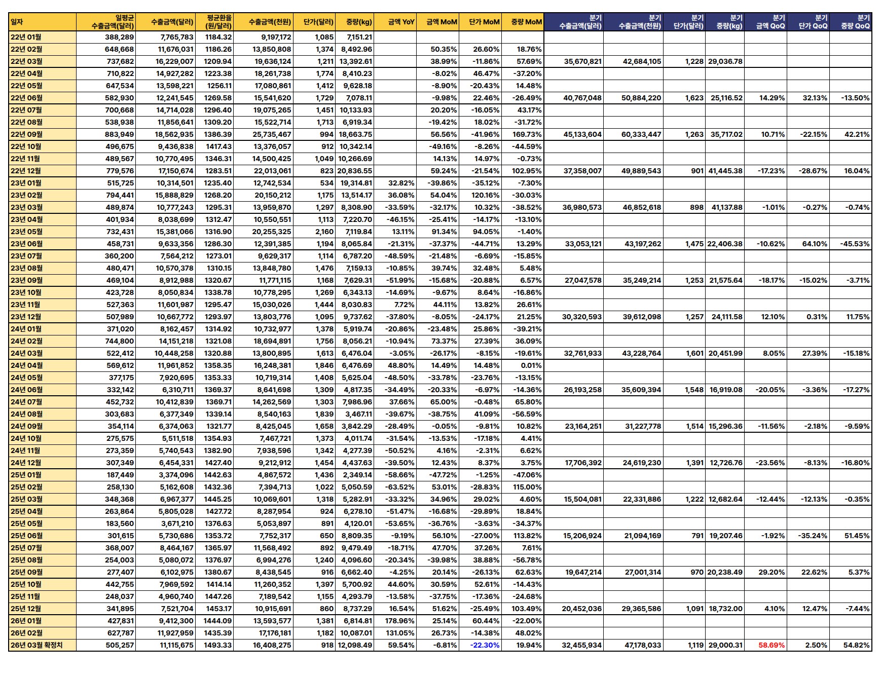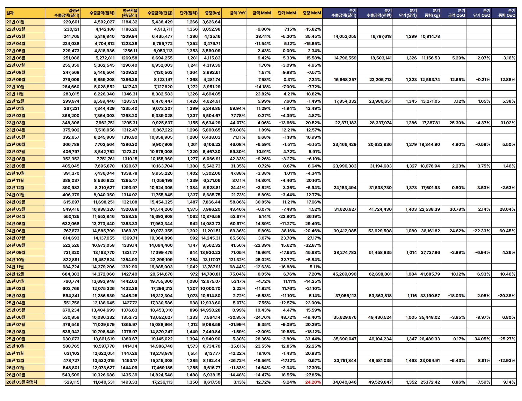 최신 수출 데이터(2026년 3월 확정치 기준)에 따르면, 수출 금액과 중량은 전월 및 전년 대비 증가세를 보이나 단가는 하락하여 전반적으로 혼조세를 나타냄.