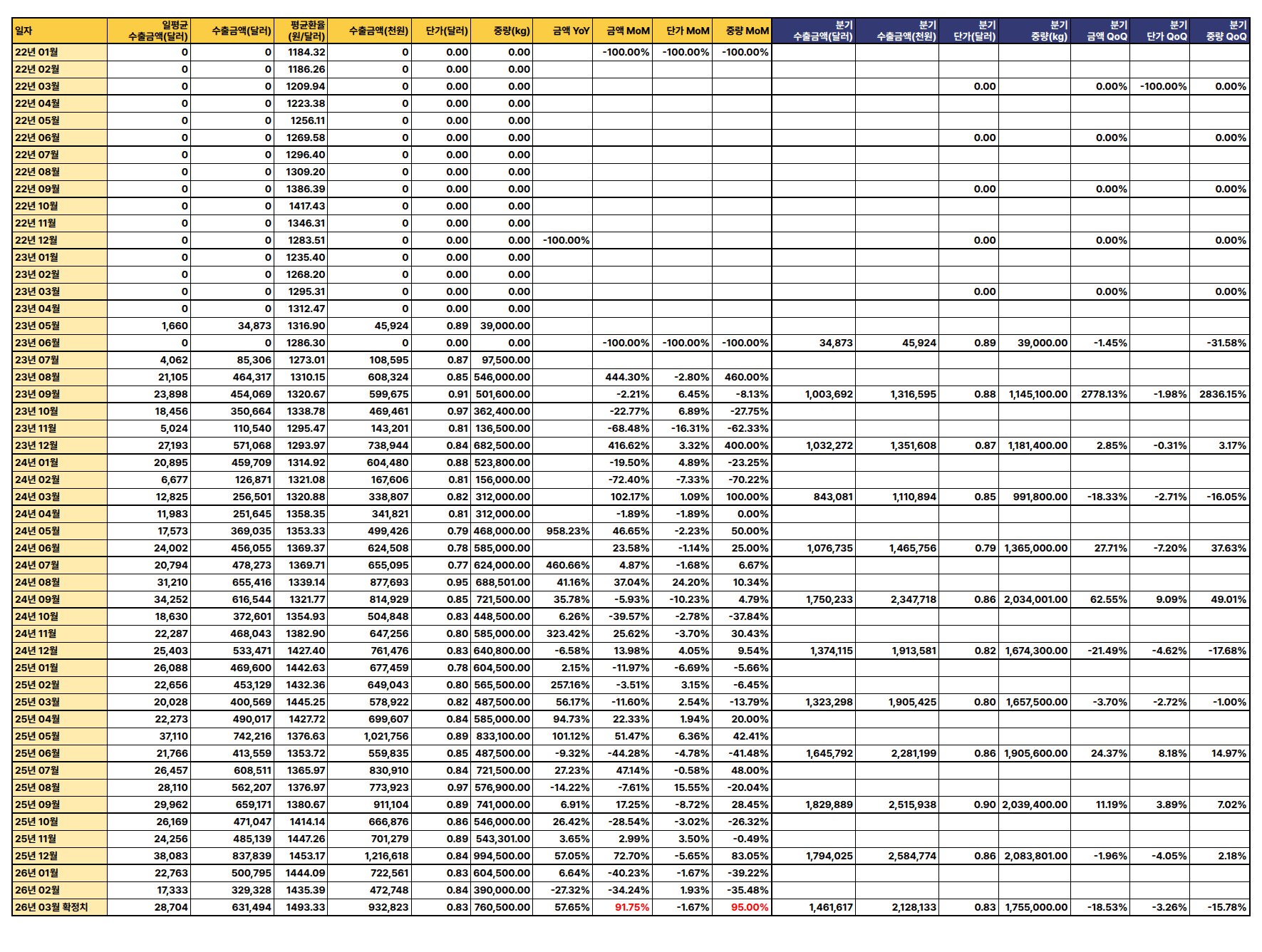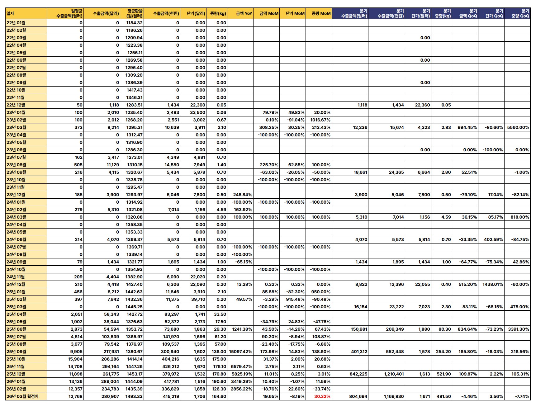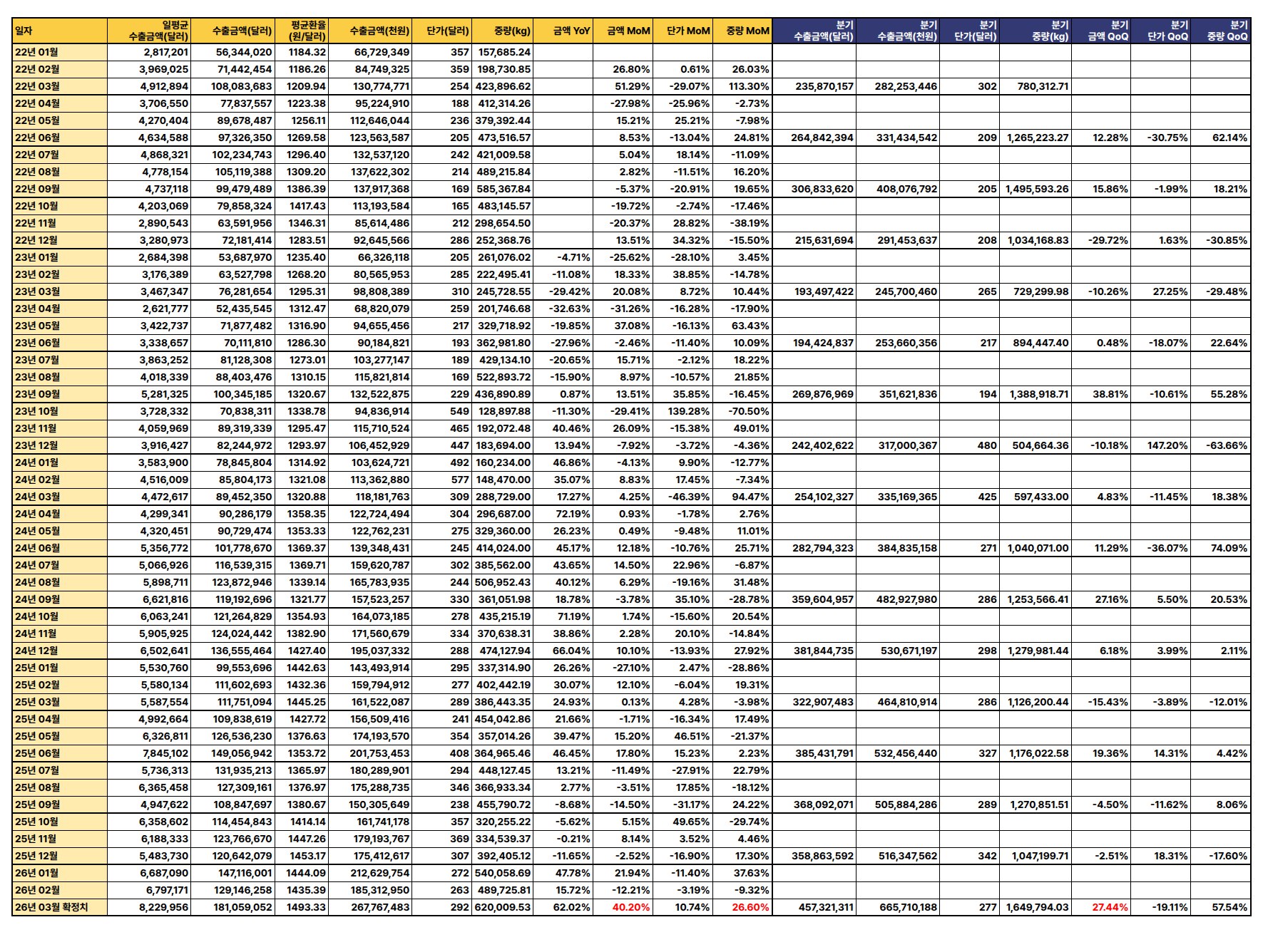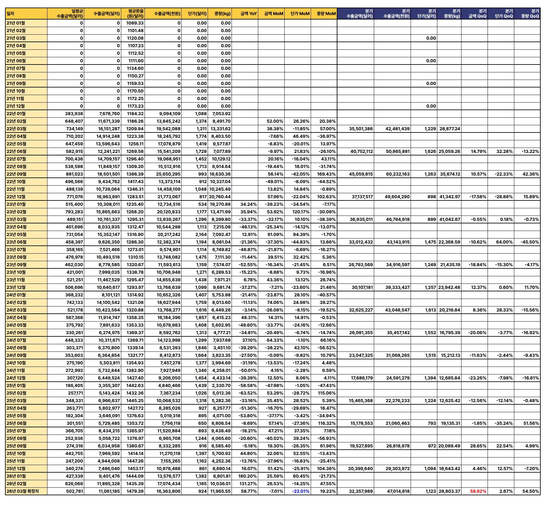 최신 수출 데이터(2026년 3월 확정치 기준)에 따르면, 수출 금액과 중량은 전월 및 전년 대비 증가세를 보이나 단가는 하락하여 전반적으로 혼조세를 나타냄.