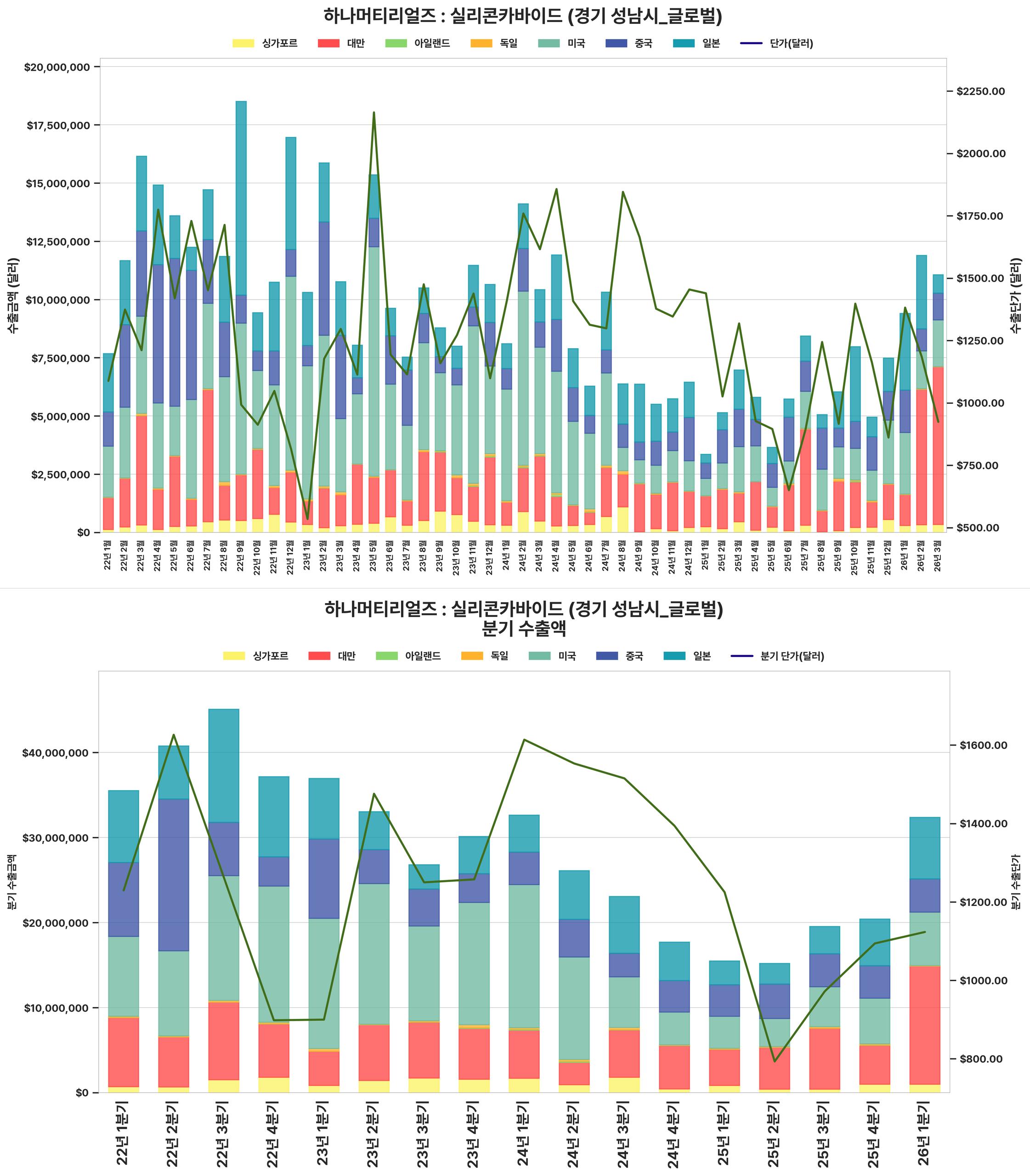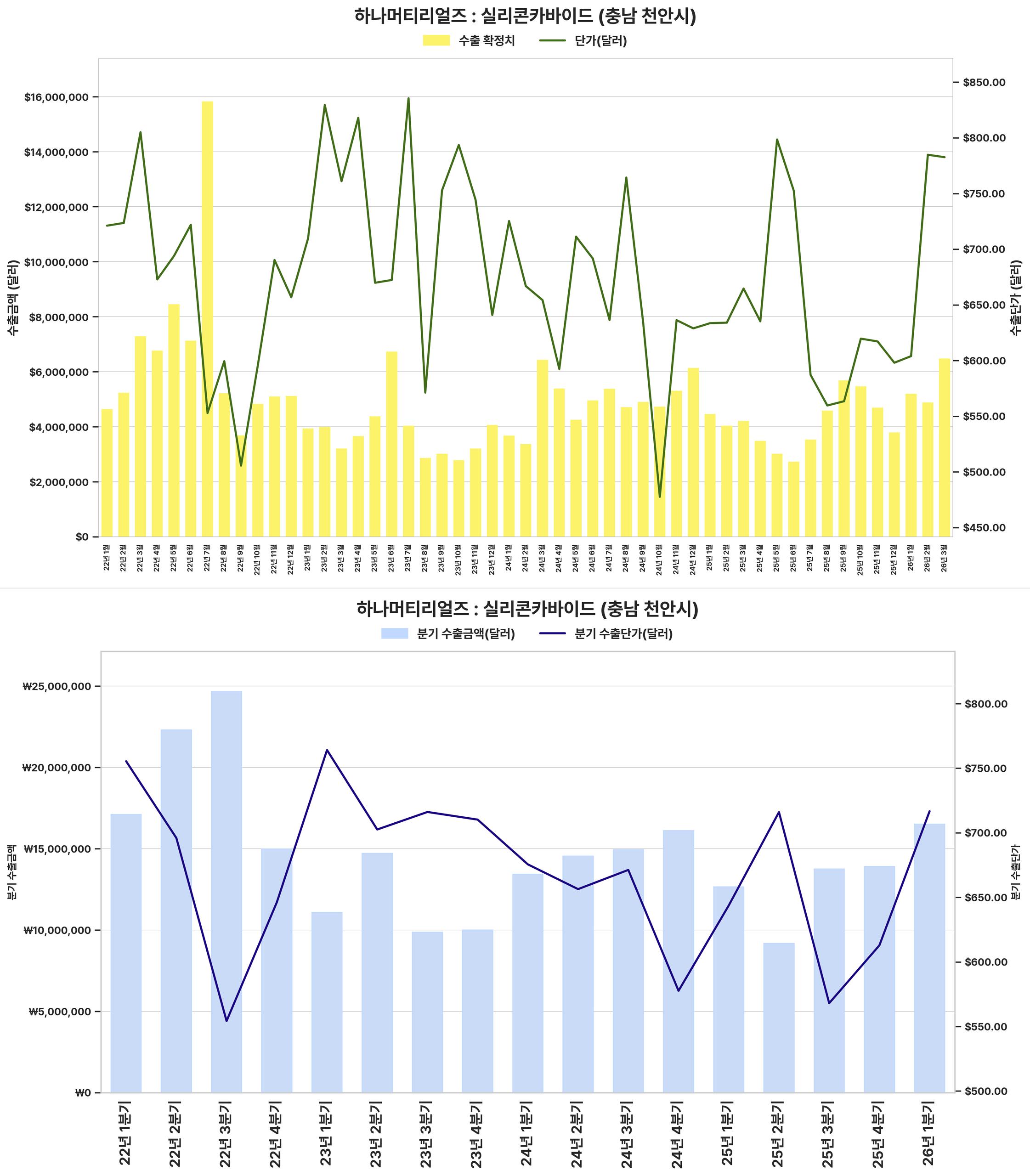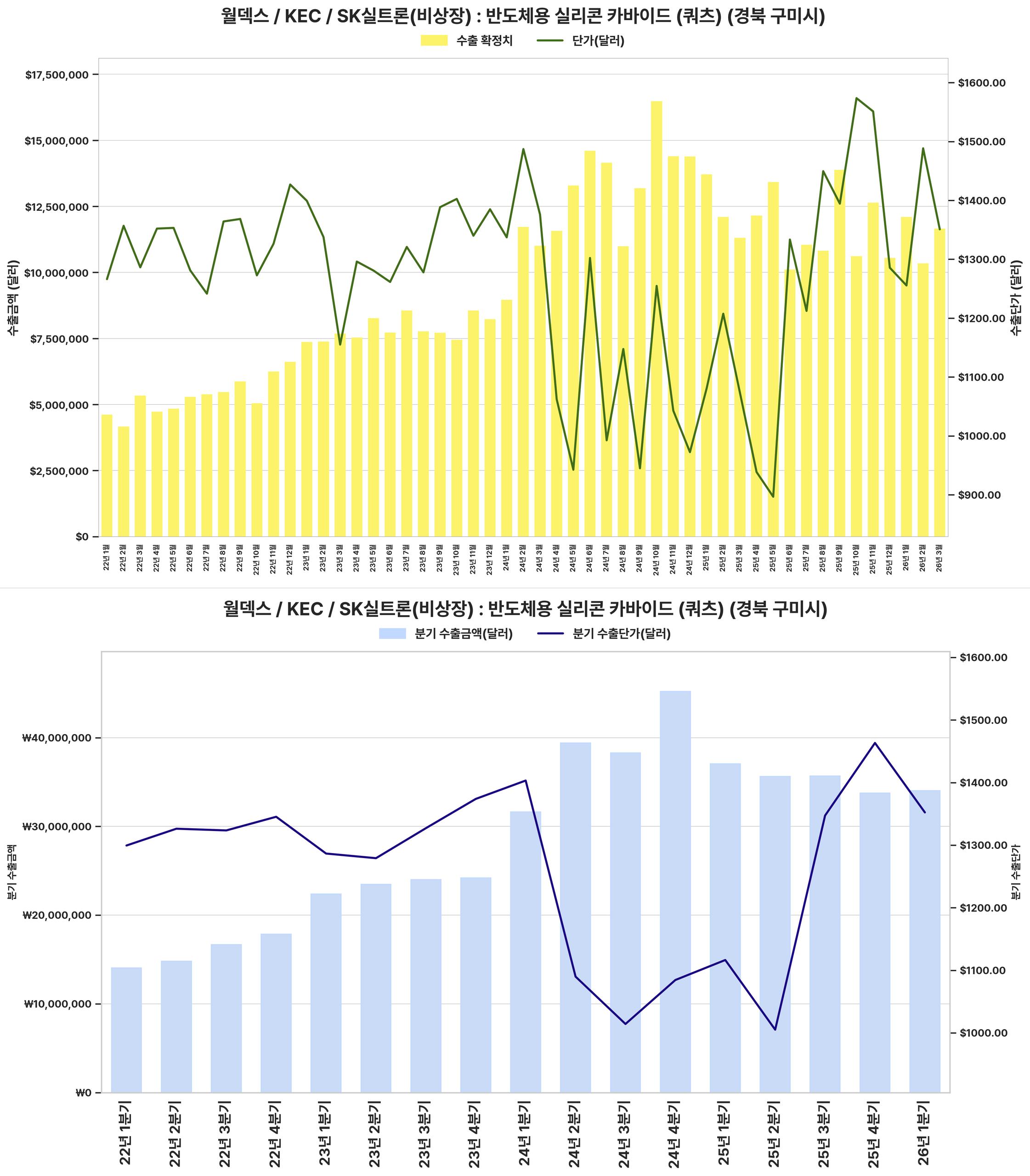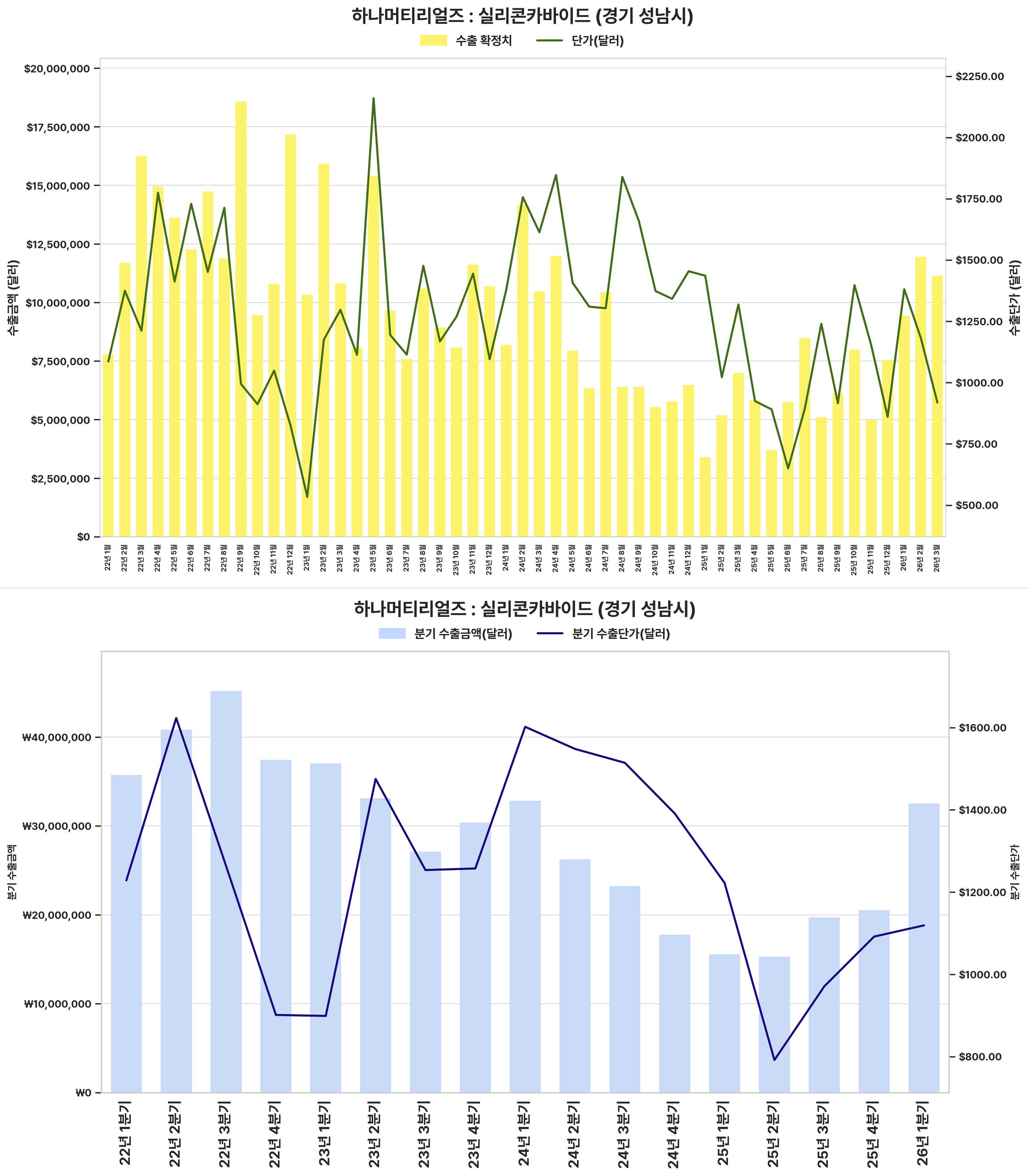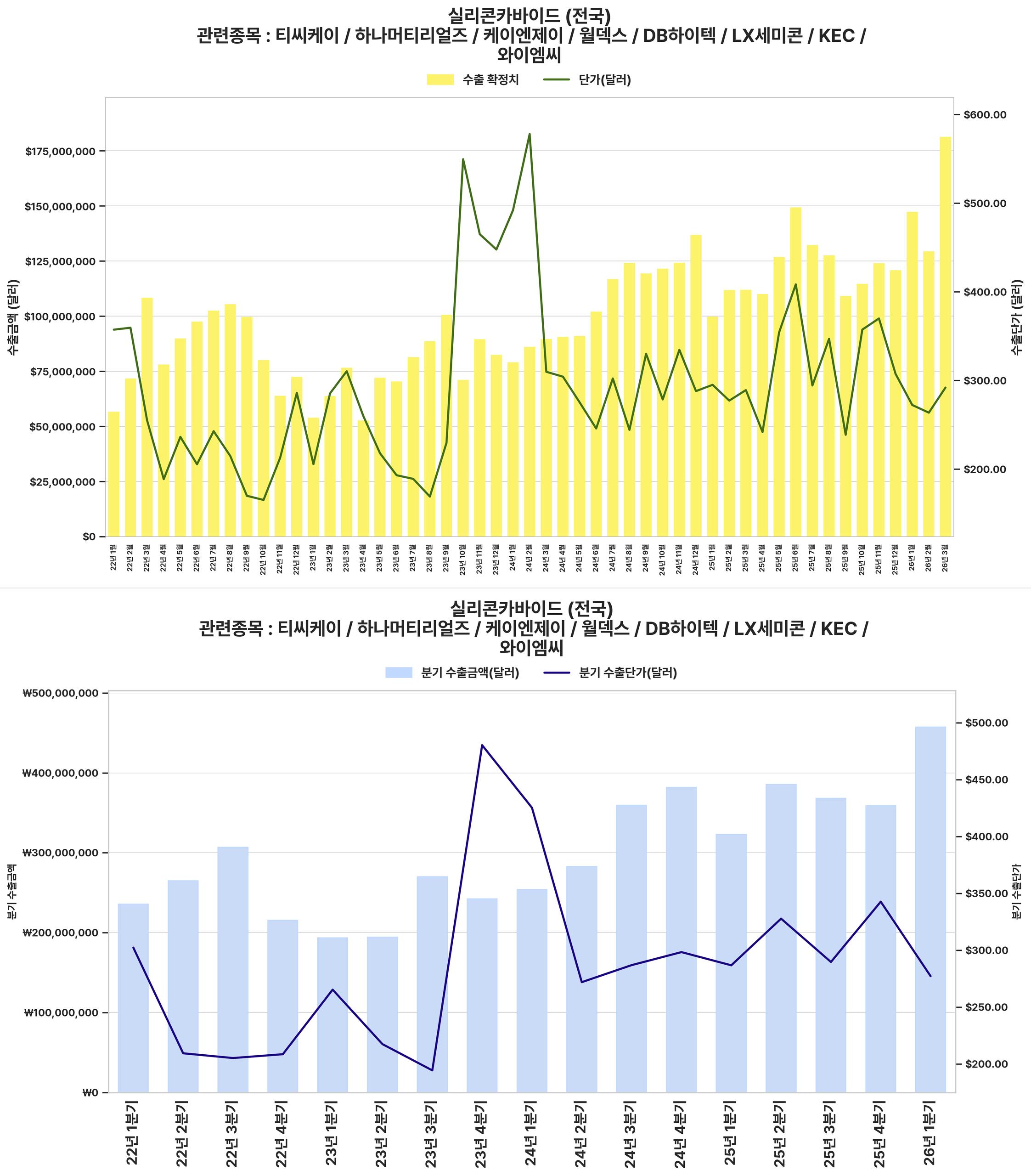 반도체용 실리콘 카바이드 시장은 2022년 초부터 2024년 말까지 수출액과 단가가 급성장했으나, 이후 2025년 초부터 2026년 초까지는 조정 국면에 진입하며 수출 감소 및 단가 하락세를 보였다.
