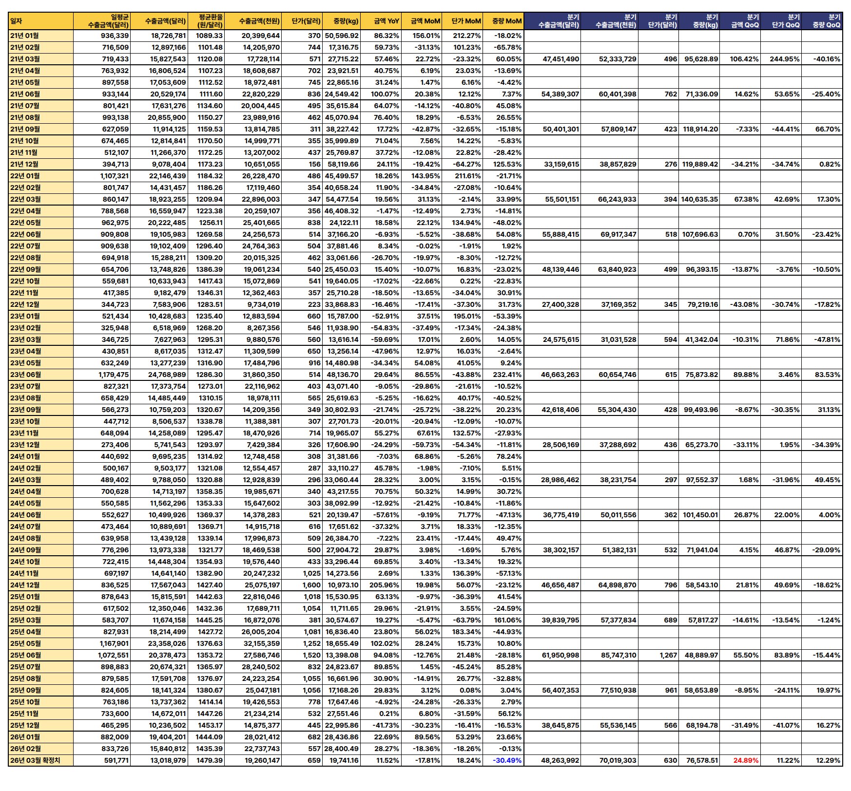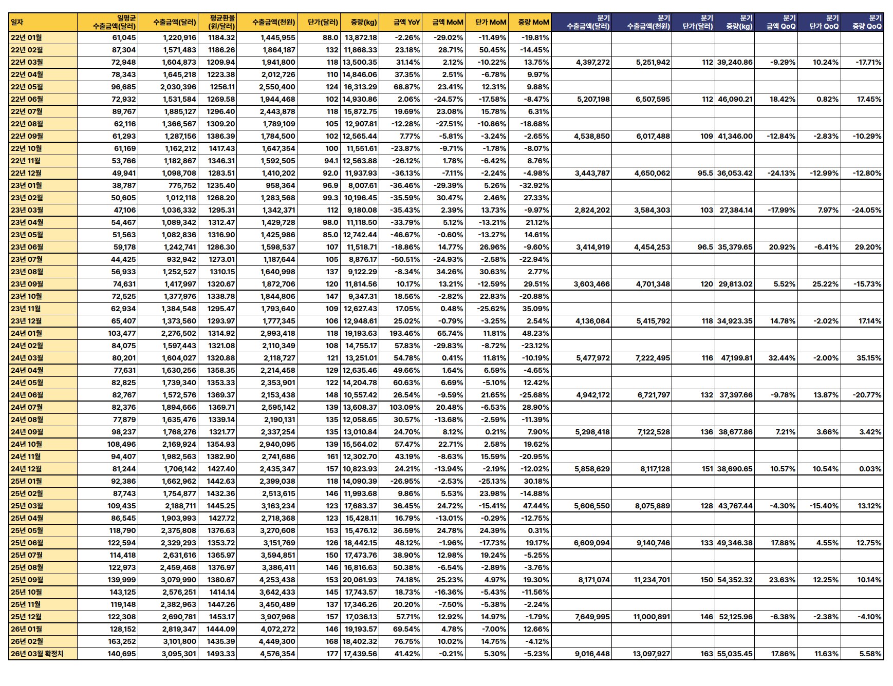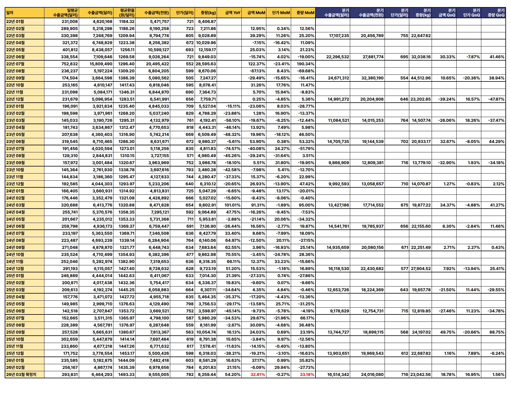 2026년 3월 수출액이 전년 동월 대비 40.7%, 전월 대비 28.91% 급증하며 강한 회복세를 보였으나, 분기별 수출액 증가율이 미미하고 단가는 하락하는 등 혼조 양상을 나타냄.