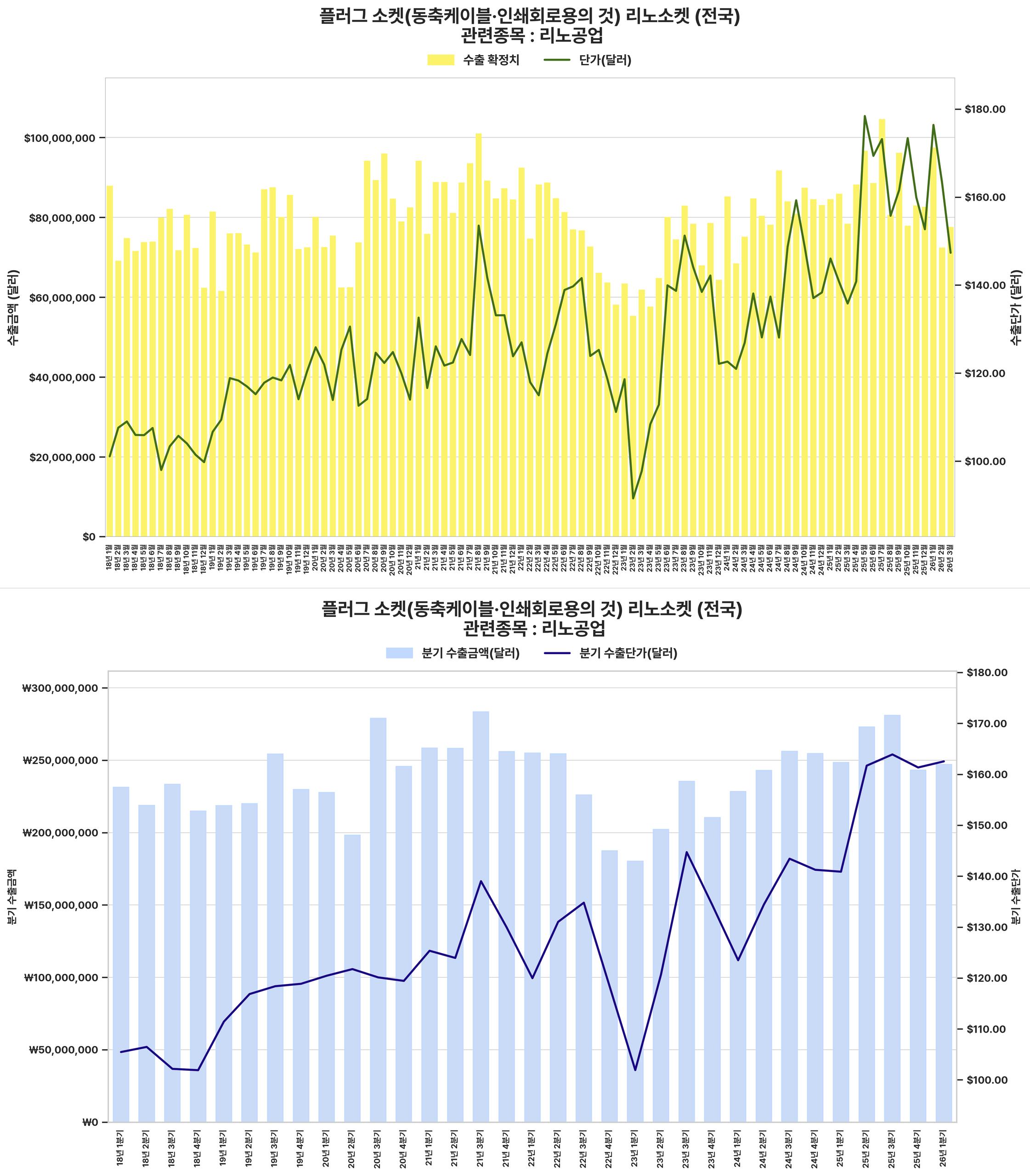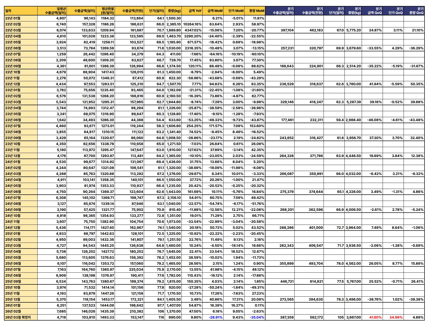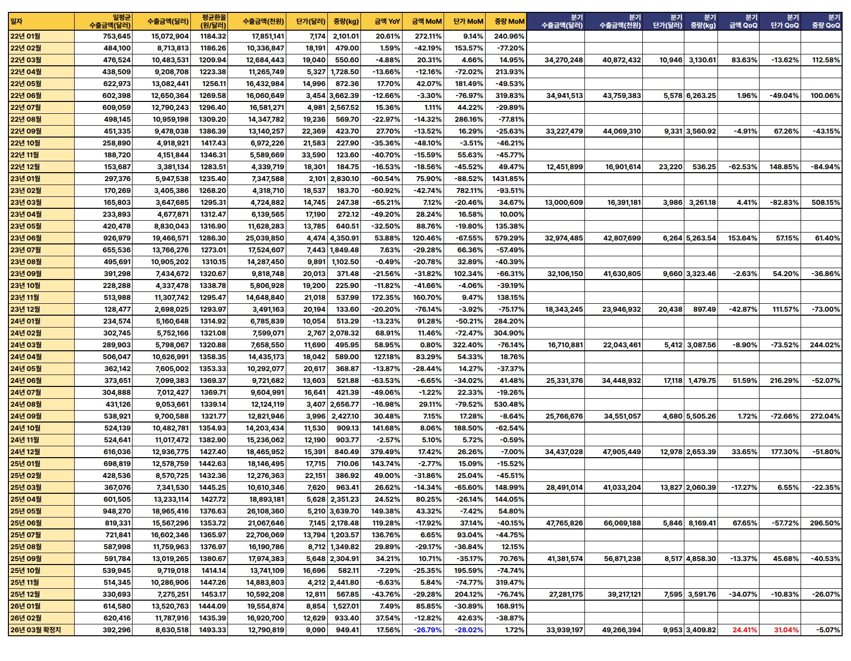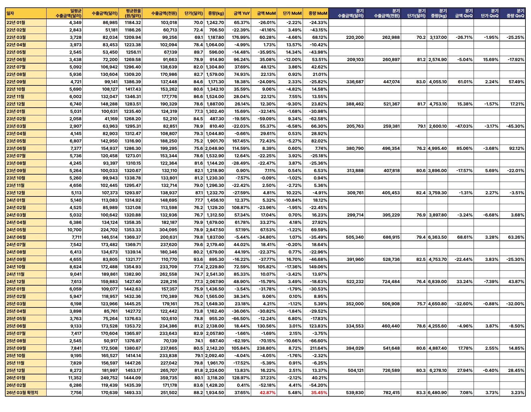2026년 3월 수출액이 전년 동월 대비 40.7%, 전월 대비 28.91% 급증하며 강한 회복세를 보였으나, 분기별 수출액 증가율이 미미하고 단가는 하락하는 등 혼조 양상을 나타냄.