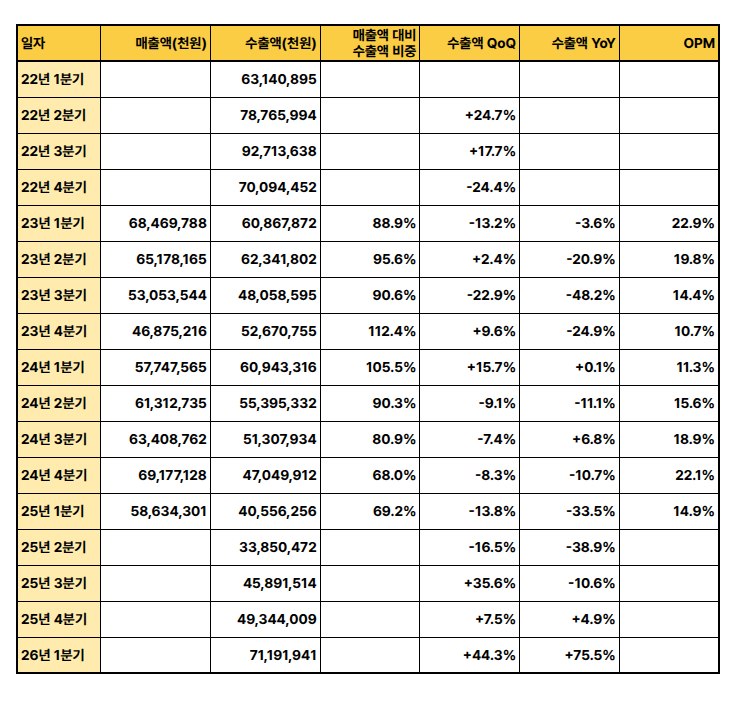최근 분기(2026년 1분기) 수출액이 전 분기 대비 44.3%, 전년 대비 75.5%로 매우 큰 폭으로 증가하며 해당 산업의 강한 회복 및 성장세가 뚜렷하다.