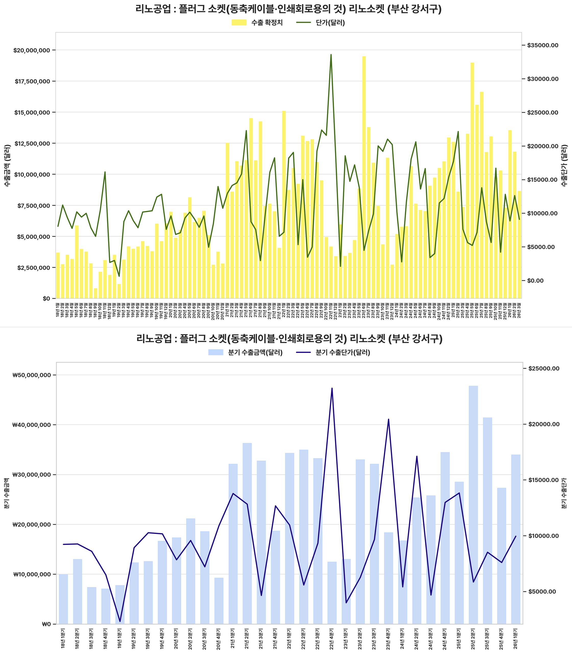 반도체 플러그 소켓 수출 시장이 2026년 1분기 기준 전분기 대비 수출액 및 단가 모두 급증하며 뚜렷한 회복세를 보임.