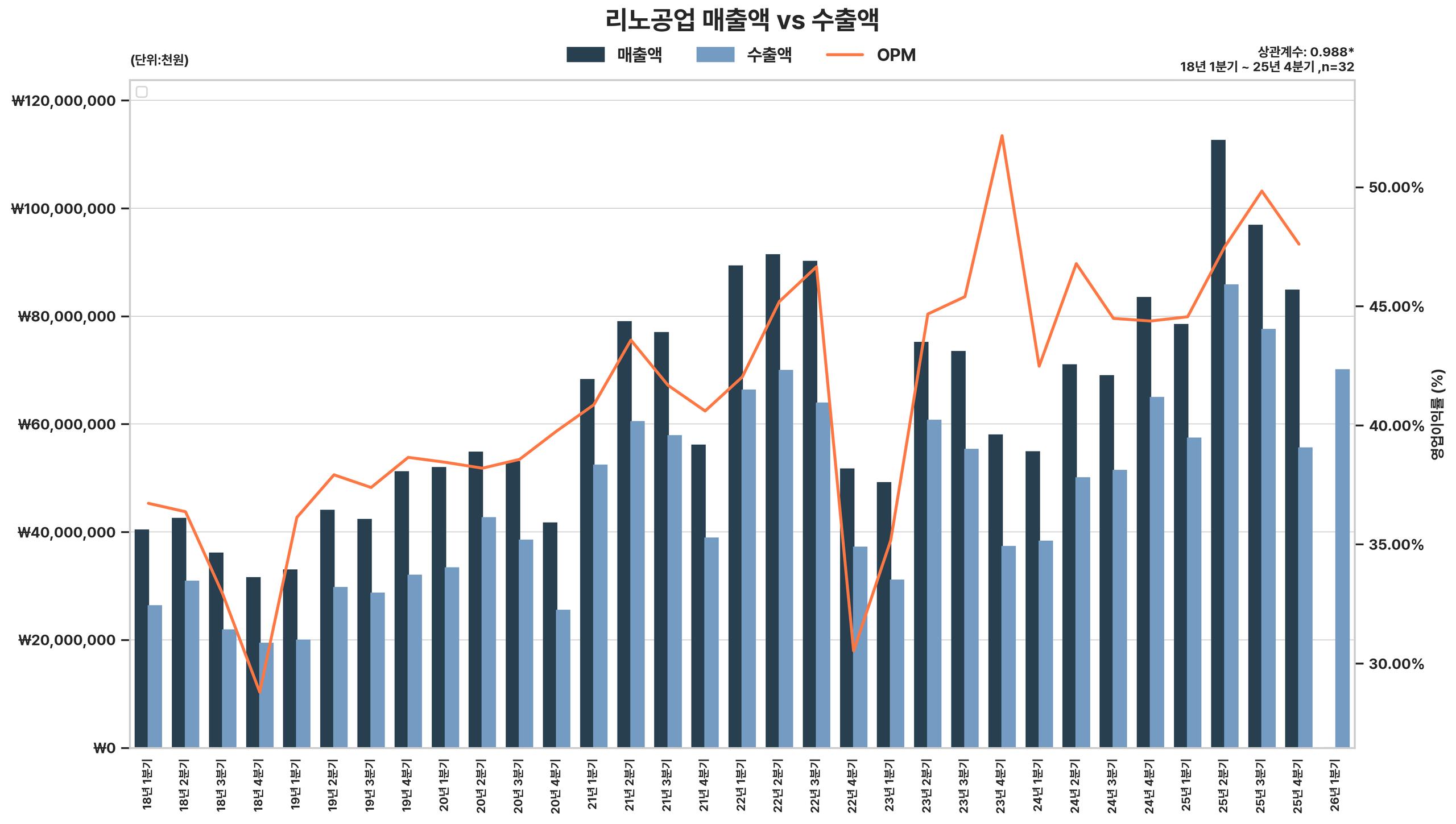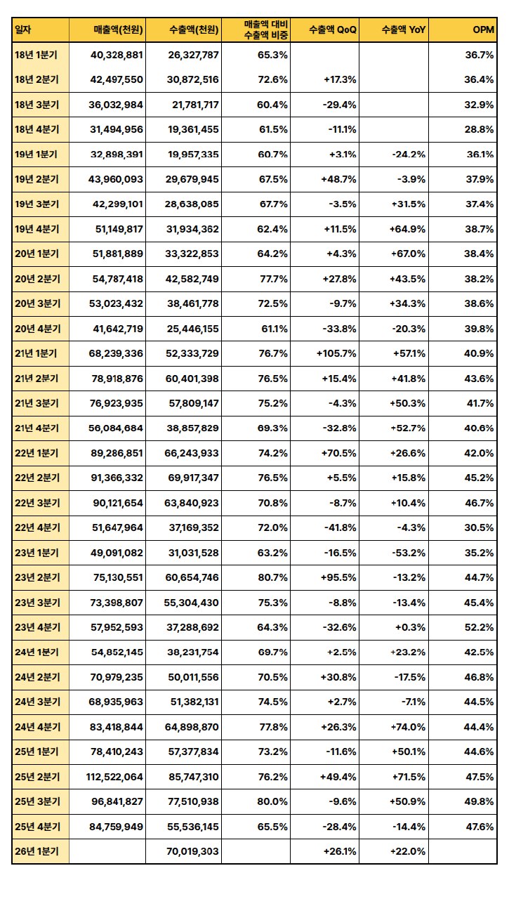리노공업은 반도체 업황 변동에 따른 매출 및 수출액의 높은 변동성을 보이나, 전반적으로 우상향 추세를 유지하며 높은 영업이익률을 지속적으로 확보하고 있음. 다만, 26년 1분기에는 매출 감소가 예상됨.
