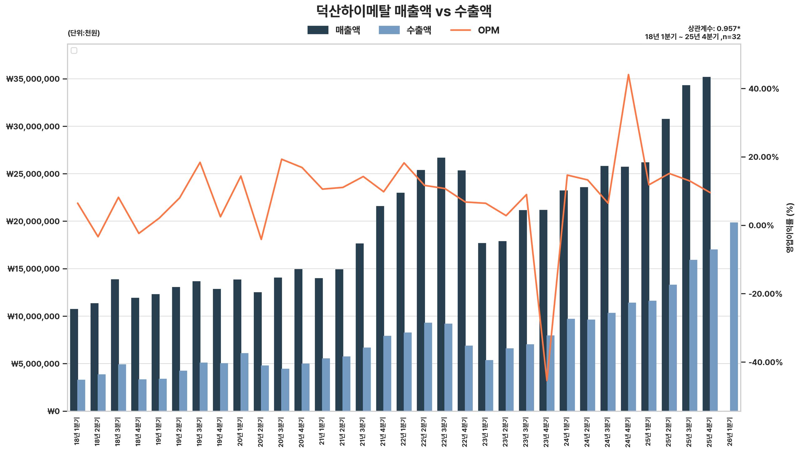 덕산하이메탈은 2023년 4분기 실적 바닥 이후 2024년 1분기부터 수출액 및 매출액이 급증하고 영업이익률이 큰 폭으로 개선되는 강력한 실적 회복세를 보이고 있다.