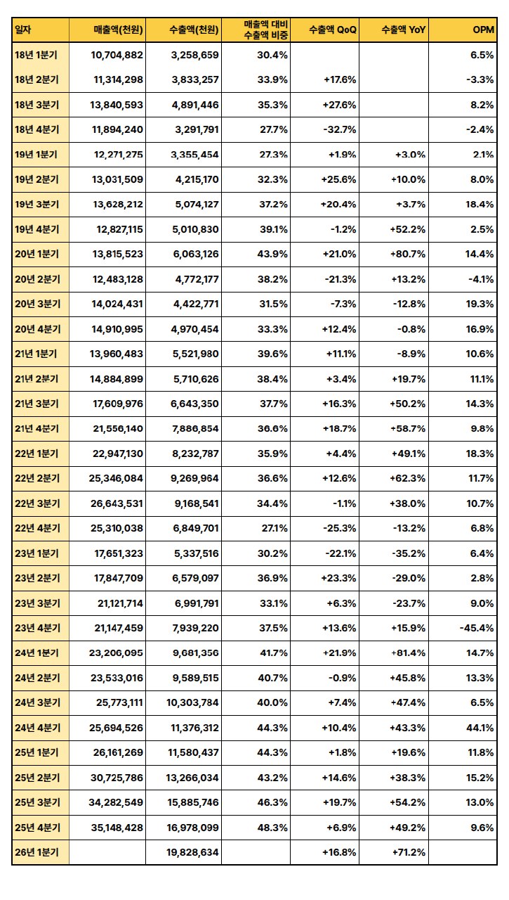2026년 1분기 수출은 단가 급증에 힘입어 전 분기 대비 큰 폭으로 증가했으며, 수출 중량은 감소하여 고부가가치 수출로의 전환을 시사합니다.