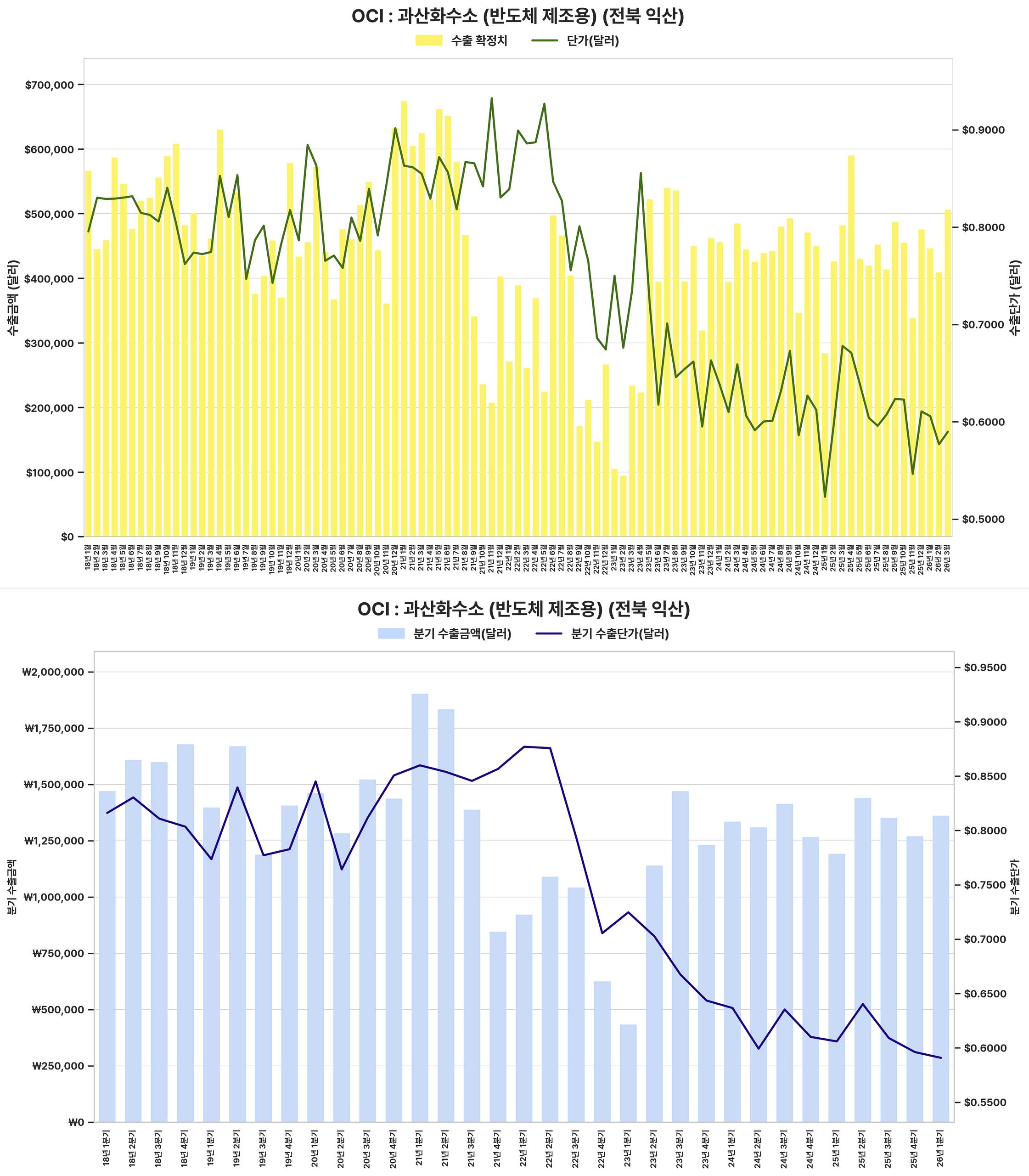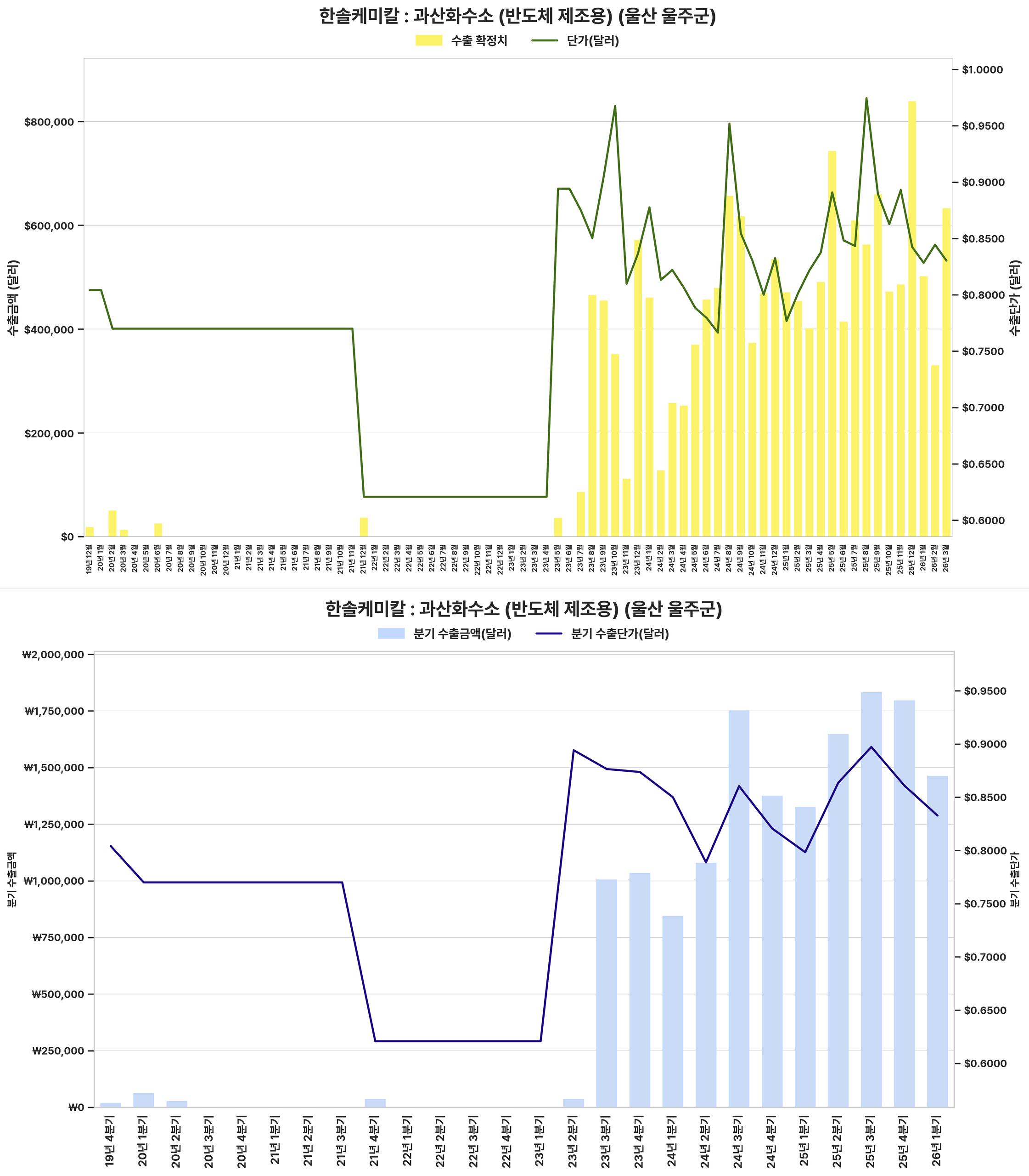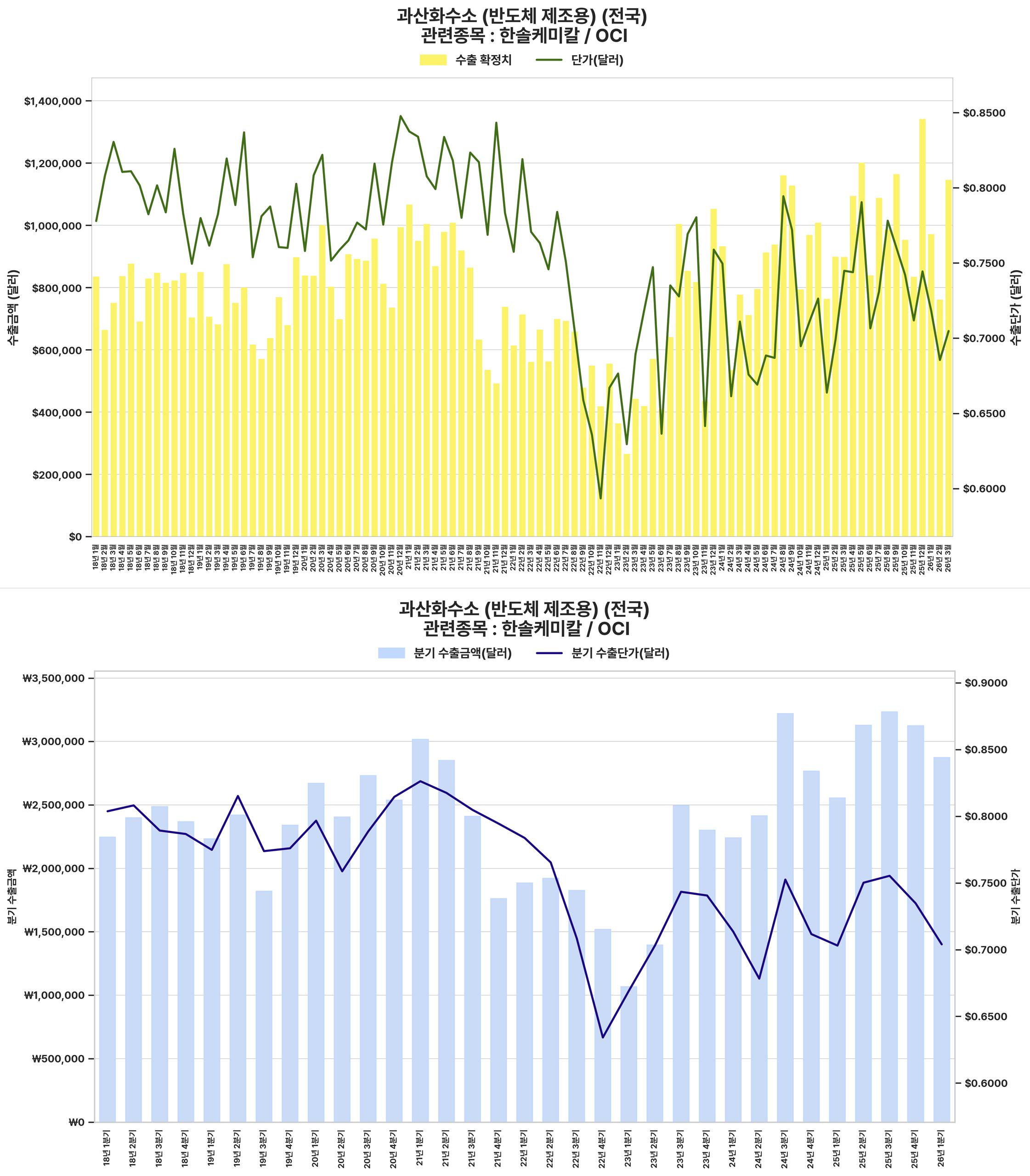 반도체 제조용 과산화수소의 수출 단가와 금액이 2022년 침체 이후 강하게 회복되었으며, 2024년 이후에도 견조한 성장세가 전망되어 관련 산업 전반의 긍정적 시그널을 제공한다.