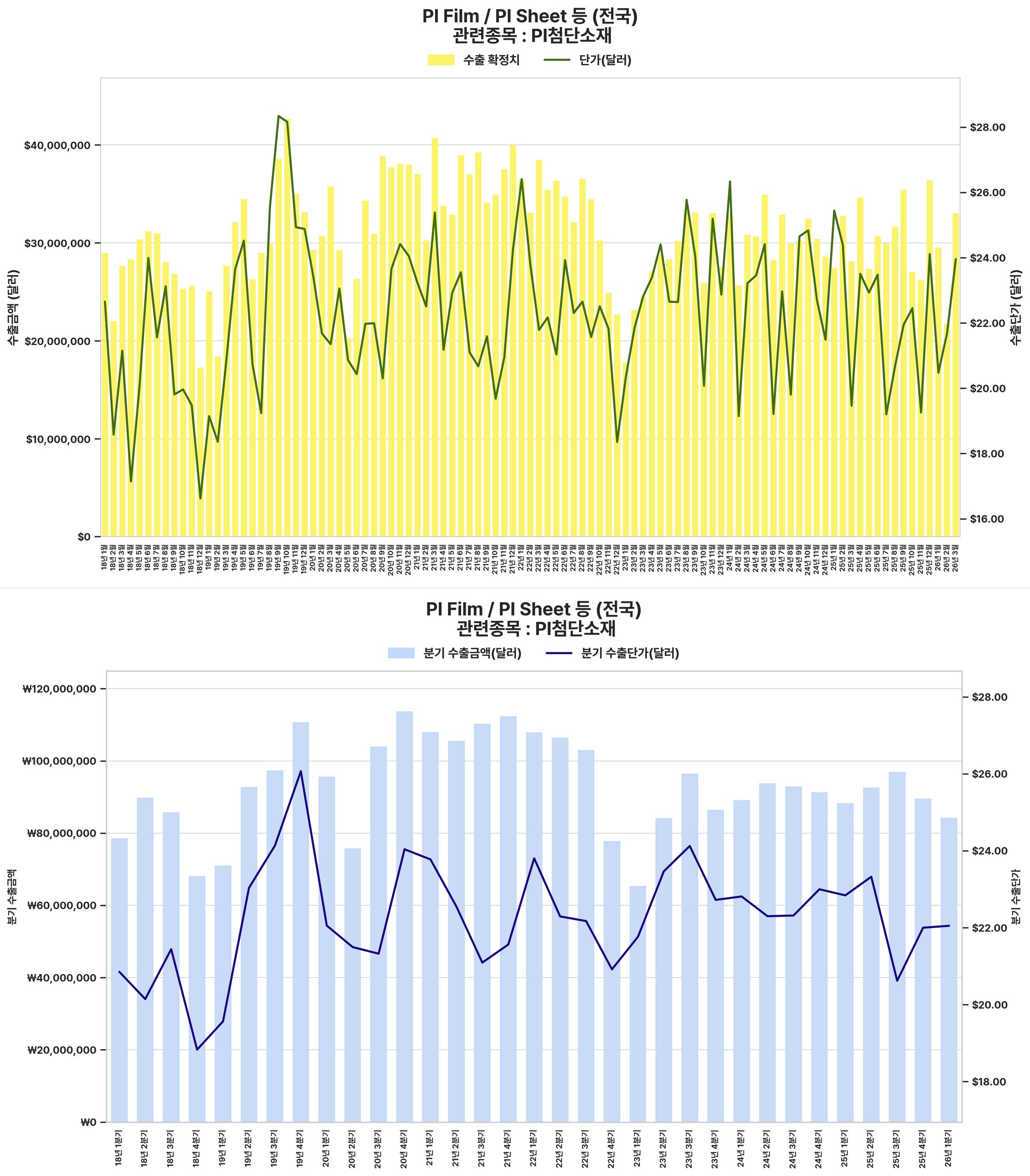 PI Film/Sheet 수출 지표가 금액과 단가 모두에서 최근 강한 회복세를 보이며 긍정적인 산업 시황을 시사한다.