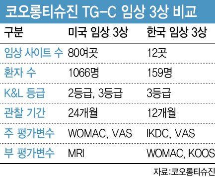 코오롱티슈진의 TG-C에 대한 미국과 한국 임상 3상 시험의 설계(규모, 평가 기준 등)를 비교하는 데이터이다.
