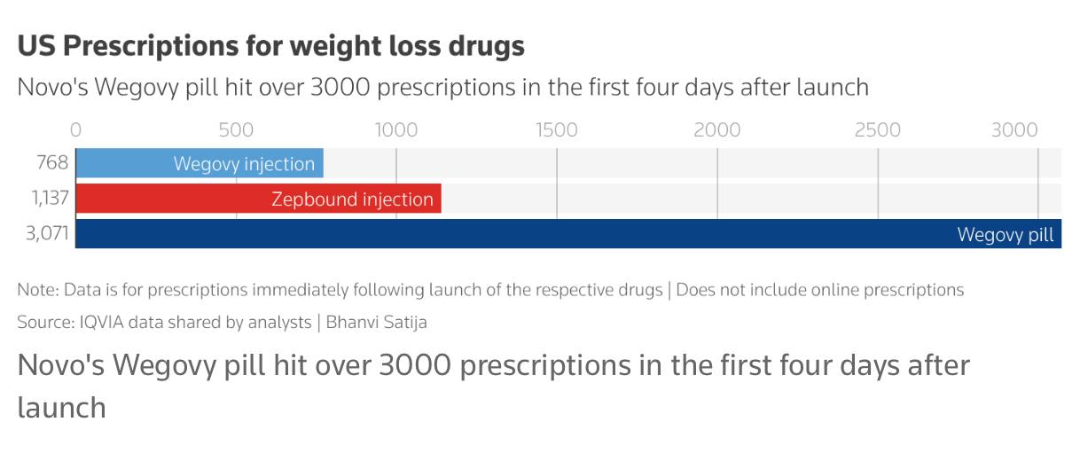 Novo Nordisk의 경구용 Wegovy가 출시 초기에 다른 주사형 체중 감량제보다 월등히 높은 처방 건수를 기록하며 시장의 높은 기대감을 보여줌.