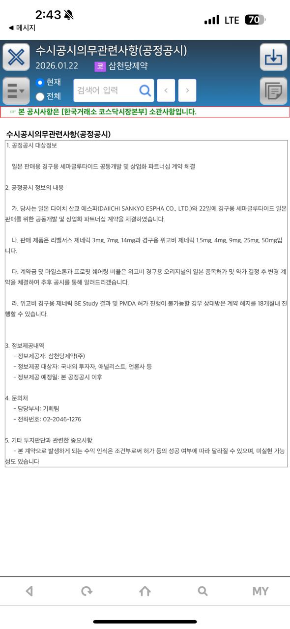일본 다이이치산쿄 에스파와의 경구용 세마글루타이드(리벨서스 제네릭) 및 위고비 제네릭 공동 개발 및 일본 내 상업화 파트너십 체결로 장기적 매출 증대 기대. 단, 수익 인식은 허가 성공 여부 및 조건에 따라 달라질 수 있음.