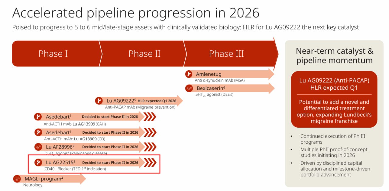 Lu AG09222 (Anti-PACAP)의 HLR(허가 기대)이 2026년 Q1으로 예정되어 있어, Lundbeck의 편두통 프랜차이즈 확장이 기대되며 이는 중장기 EPS 추정치 상향 요인으로 작용할 수 있음.
