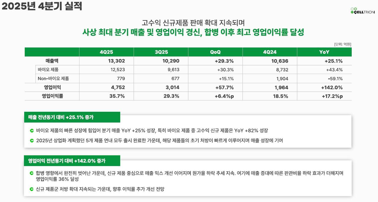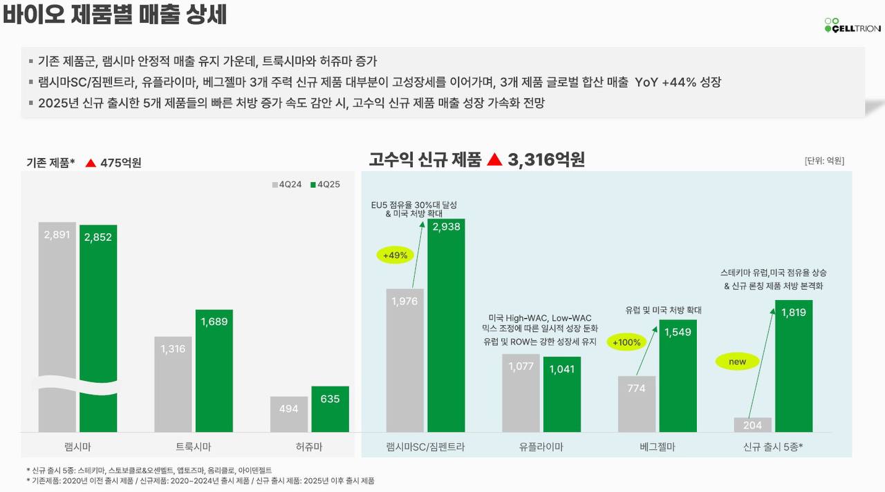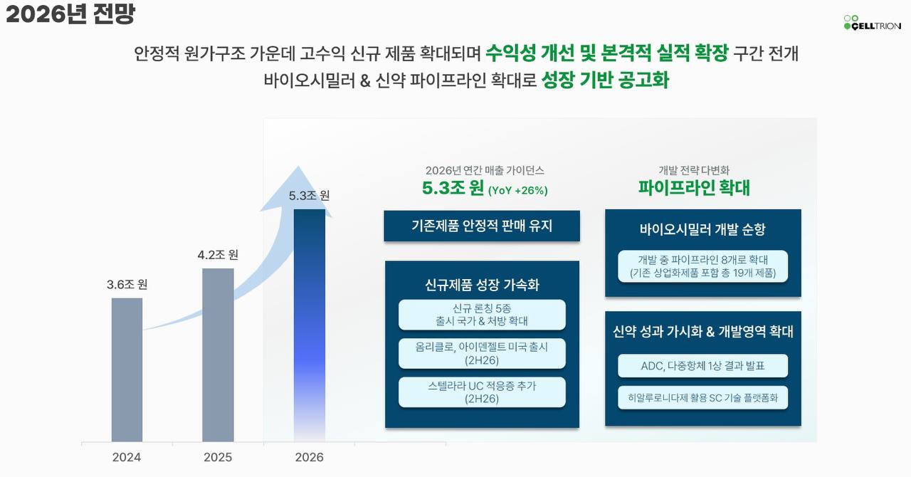 2026년 연간 매출 5.3조원(YoY +26%) 달성 및 신규 고수익 제품 런칭(옴리클론, 아이덴젤트 미국 출시 등), 바이오시밀러/신약 파이프라인 확대로 실적 및 수익성 개선에 기여, EPS 상승 예상.