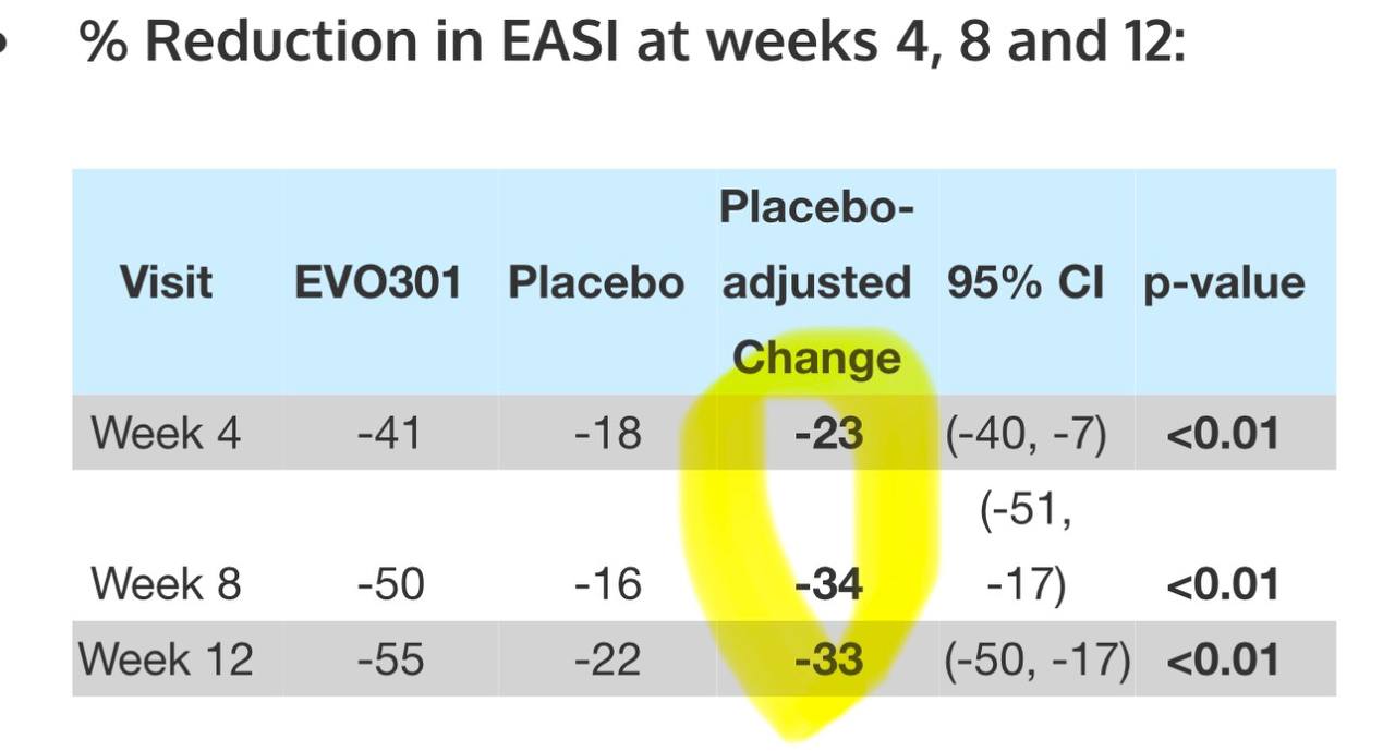 신약 후보물질 EVO301이 아토피 등 피부질환 지표(EASI)를 위약 대비 통계적으로 유의미하게 감소시켰으며, 치료 효과가 12주간 지속됨을 확인.