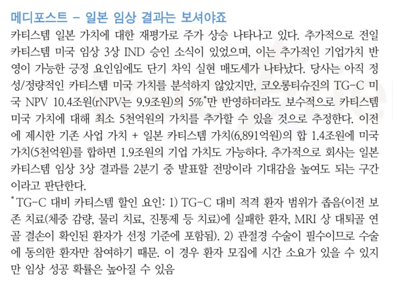 카티스템 일본 가치 재평가 및 미국 임상 3상 IND 승인 소식, 미국 시장에서 최소 5천억 원의 추가 가치 반영 추정, 기존 사업과 합쳐 총 1.9조 원의 기업 가치 가능성, 일본 임상 3상 결과 2분기 발표 기대감 등으로 기업 가치 및 미래 수익성 상향 조정 요인.