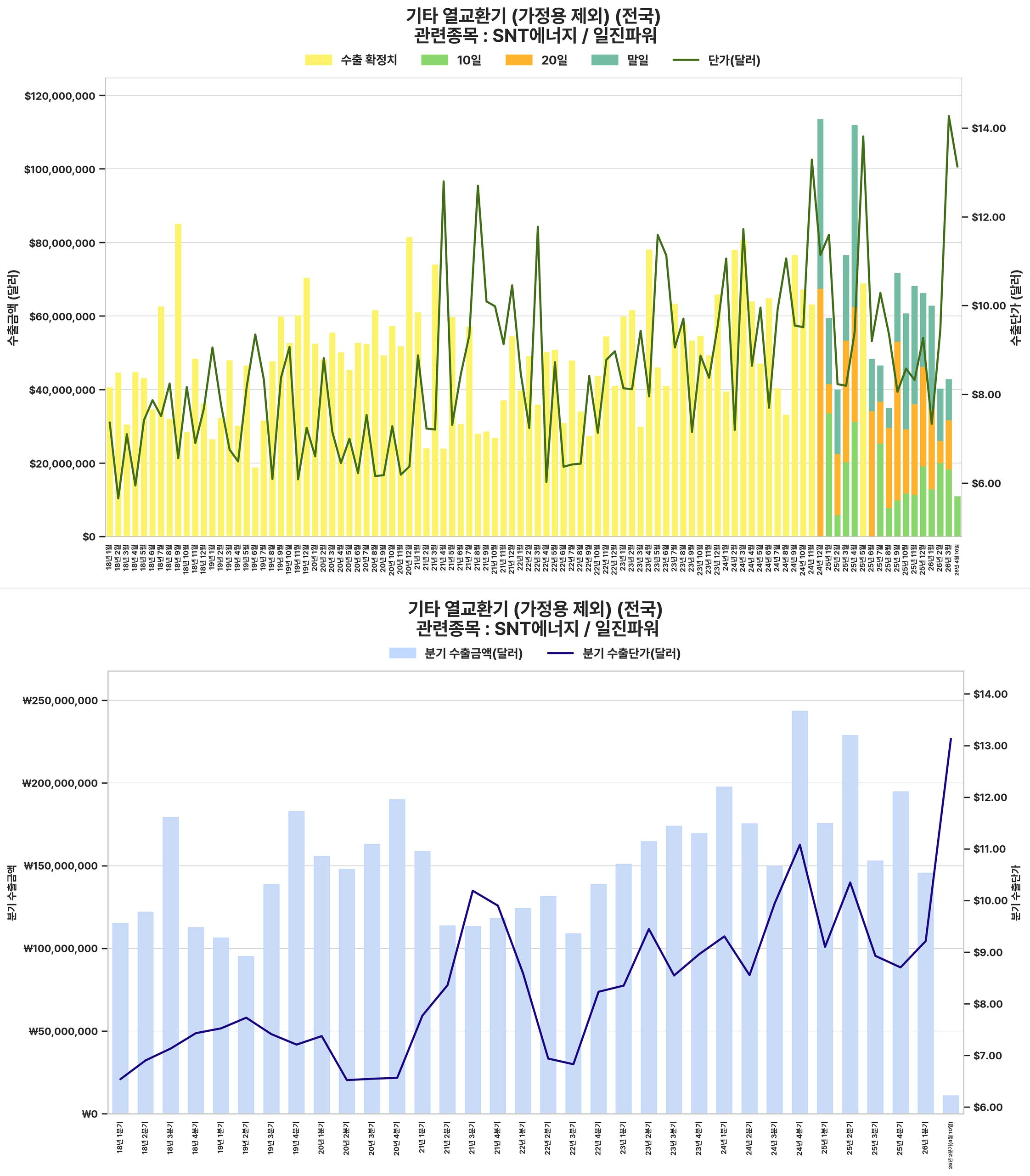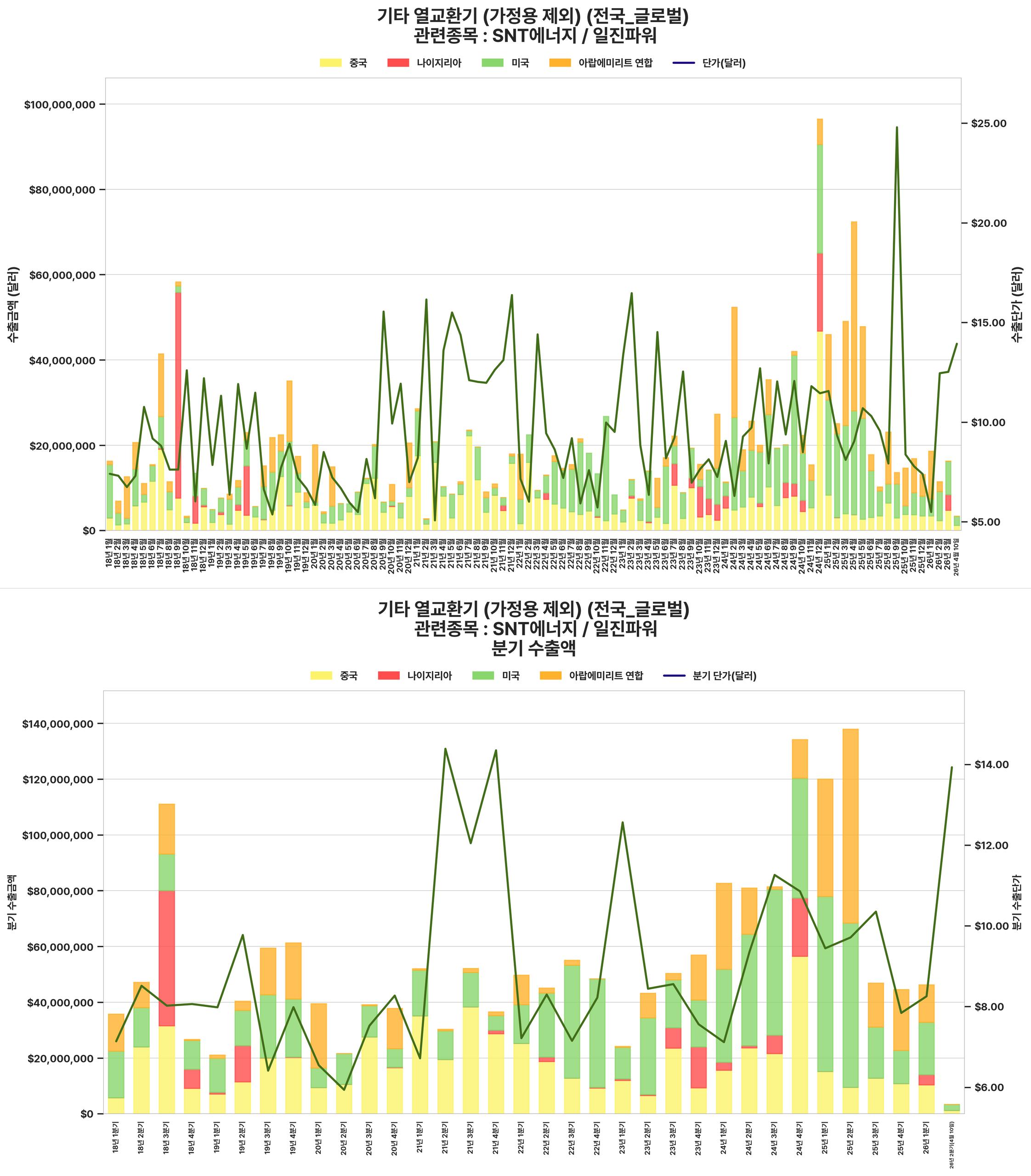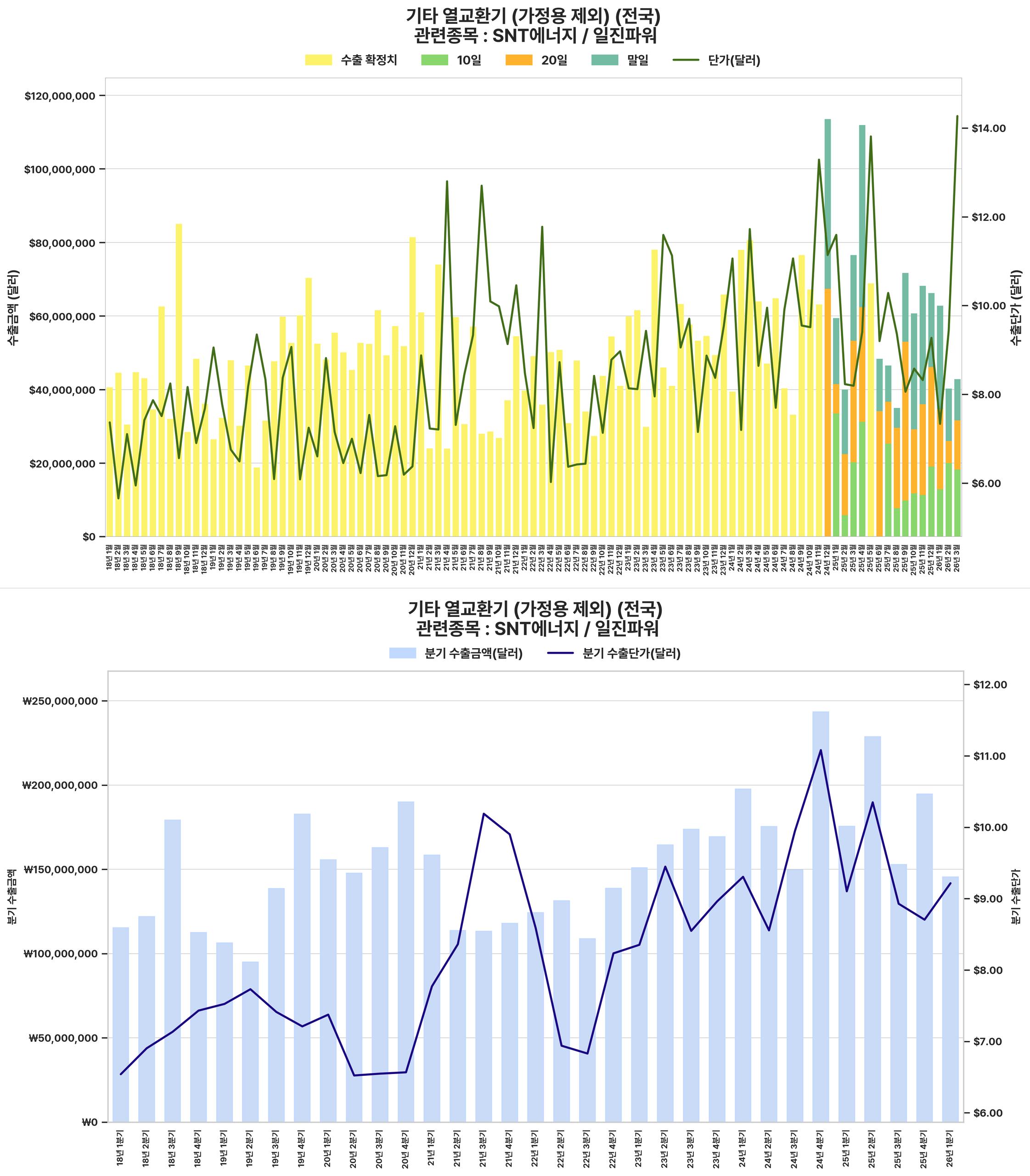 원전 및 산업용 열교환기 수출 단가 및 총액의 지속적인 상승세 (특히 2025년 말-2026년 초 단가 급등)는 SNT에너지와 같은 관련 기업의 매출 및 수익성 개선에 긍정적으로 작용할 것임.