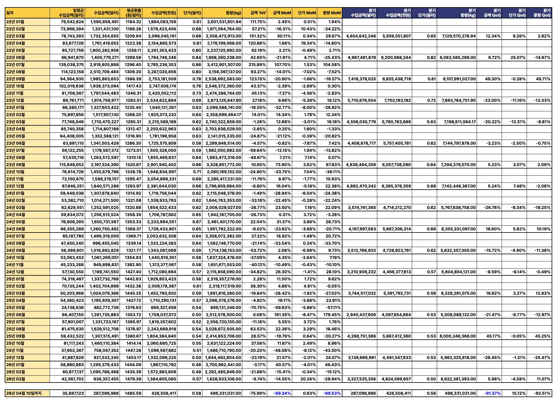 2026년 1분기 총수입금액 및 총중량이 전분기 대비 증가세를 보였으나, 3월과 특히 4월(10일까지)의 월별 데이터는 수입금액과 총중량에서 급격한 감소세를 나타내며 전체적인 무역 활동의 둔화를 시사합니다.