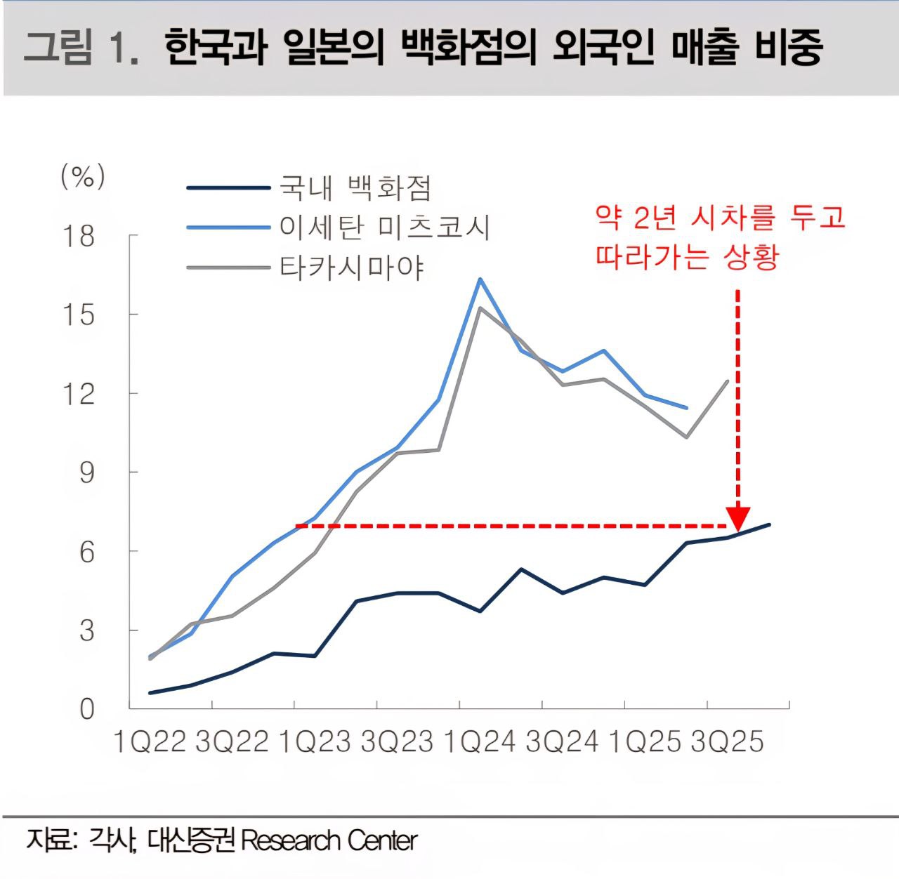 한국 백화점의 외국인 매출 비중은 일본 백화점의 추세를 약 2년의 시차를 두고 따라가며 꾸준히 증가할 것으로 전망된다.
