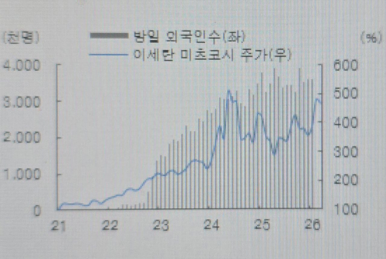 일본 방문 외국인 수의 급증이 일본 유통업체의 주가에 매우 긍정적인 영향을 미치고 있음을 보여줌.