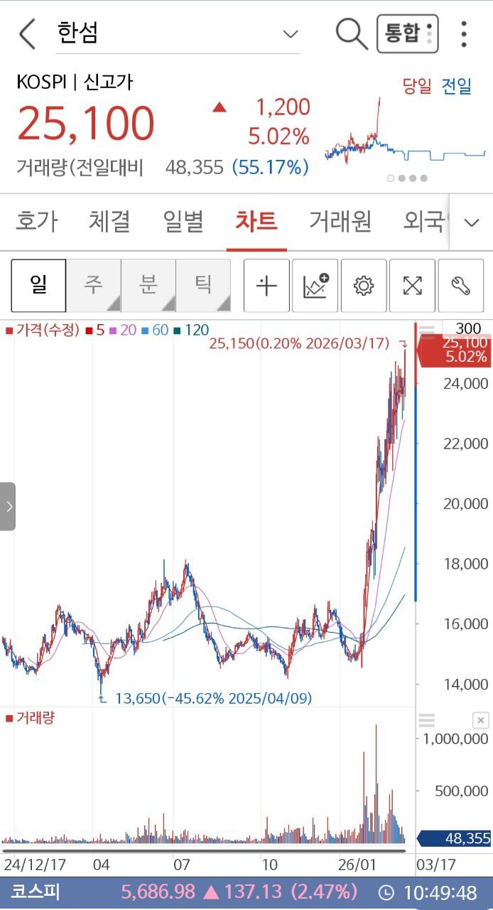 유통 업종의 한 종목이 신고가를 경신하며 강한 상승 흐름과 높은 거래량을 기록하고 있다.