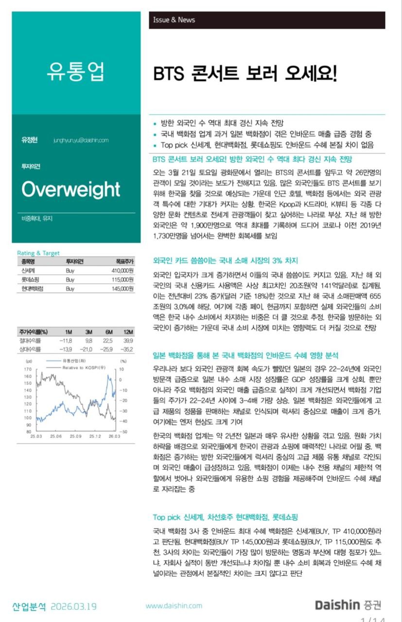 방한 외국인 관광객 수와 소비가 역대 최고치를 기록하며 국내 유통업, 특히 백화점 업계의 매출 및 이익 개선이 기대된다.