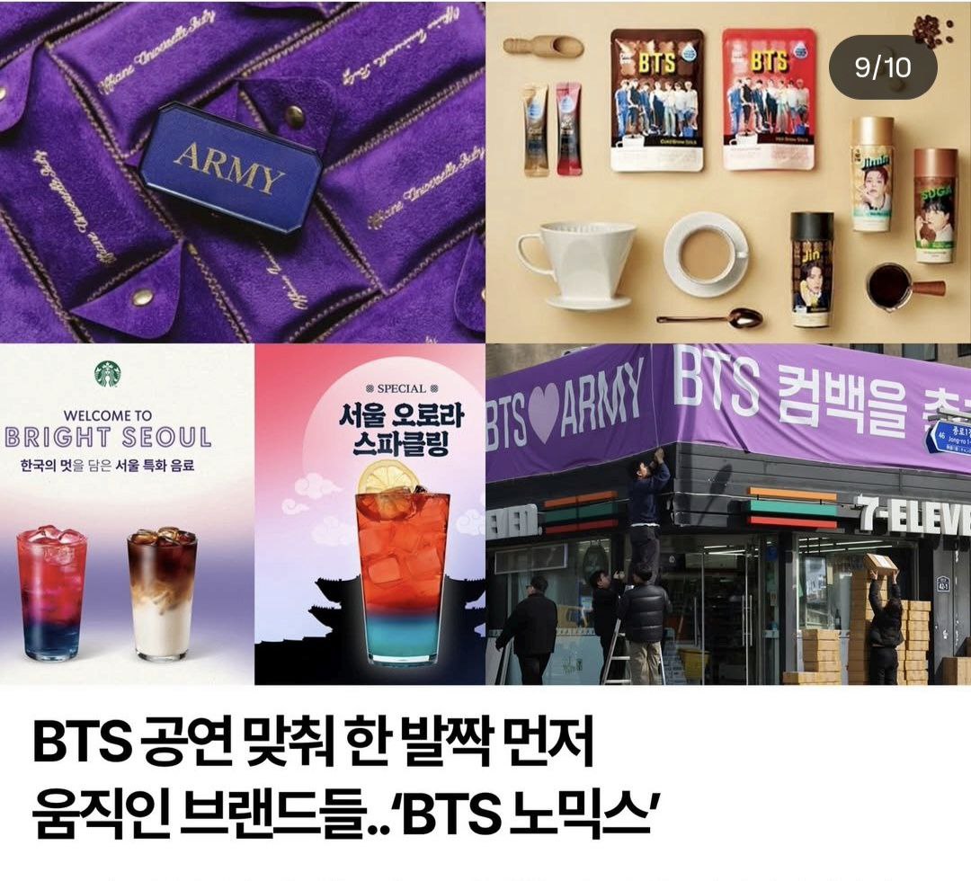 BTS의 강력한 팬덤과 컴백/공연 효과를 활용한 유통 및 식품 브랜드들의 적극적인 마케팅 및 협업이 활발히 진행 중이며, 이는 관련 기업들의 매출 증대에 기여할 것으로 예상됨.