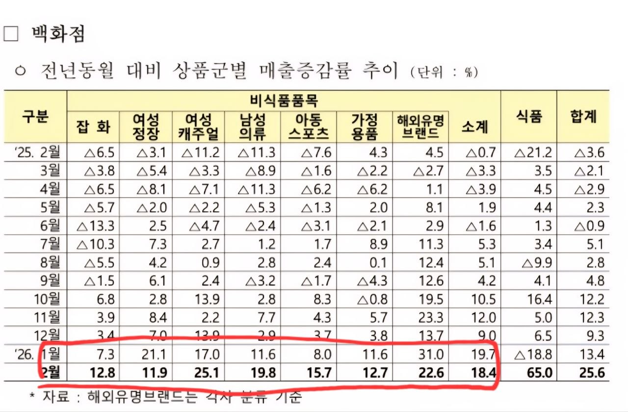 2026년 2월 백화점 전반의 매우 높은 매출 성장률(전체 +25.6%, 특히 식품 +65.0%, 패션/브랜드 품목 +20% 이상)은 주요 백화점 기업의 실적 개선 및 EPS 상향 요인으로 작용할 것으로 예상됨.