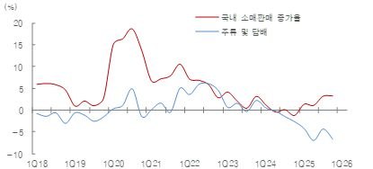 국내 소매판매 증가율은 2024년 저점 이후 회복세를 보이지만, 주류 및 담배 판매 증가율은 최근 지속적으로 감소하는 추세입니다.
