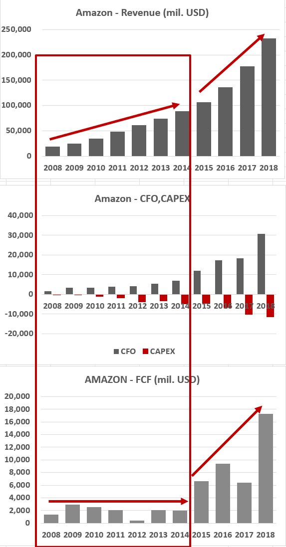2014년을 기점으로 아마존의 매출, 영업 현금흐름, 자유 현금흐름이 급격히 증가하며 사업 성장이 가속화되는 추세.