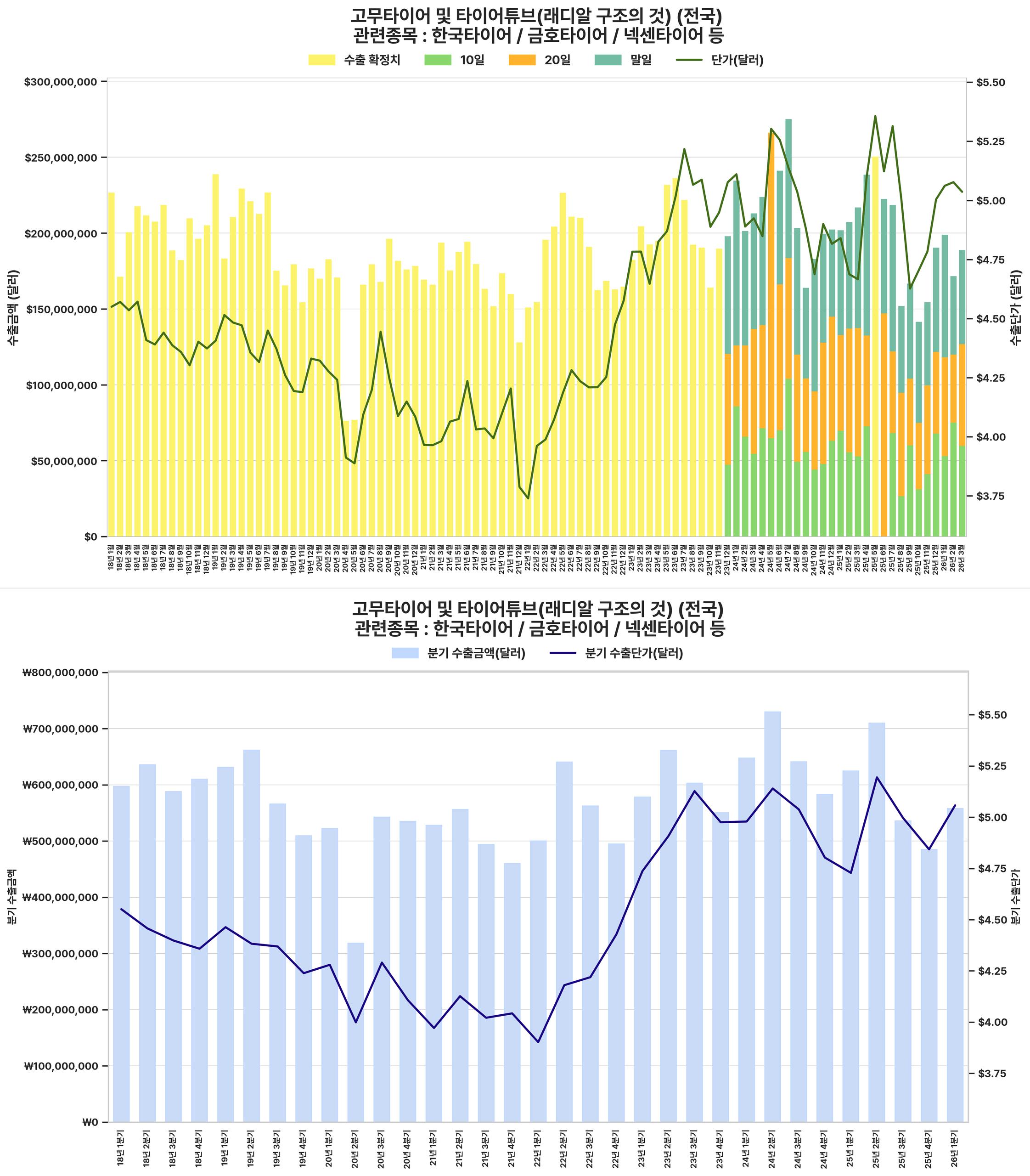 전반적으로 타이어 수출 금액과 단가가 2024년부터 2026년까지 가파른 성장세를 보이며, 산업 전반의 긍정적인 전망을 시사한다.