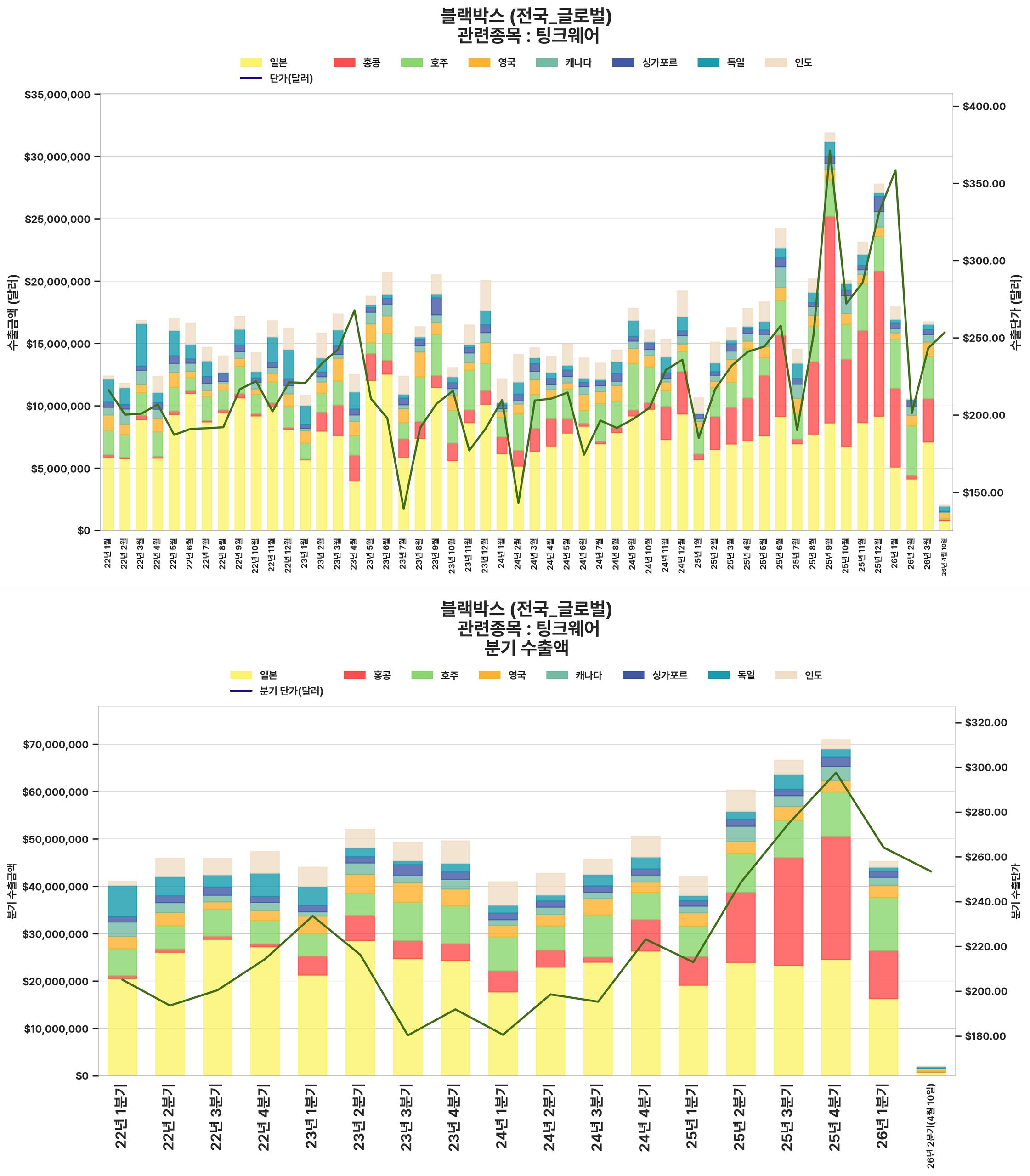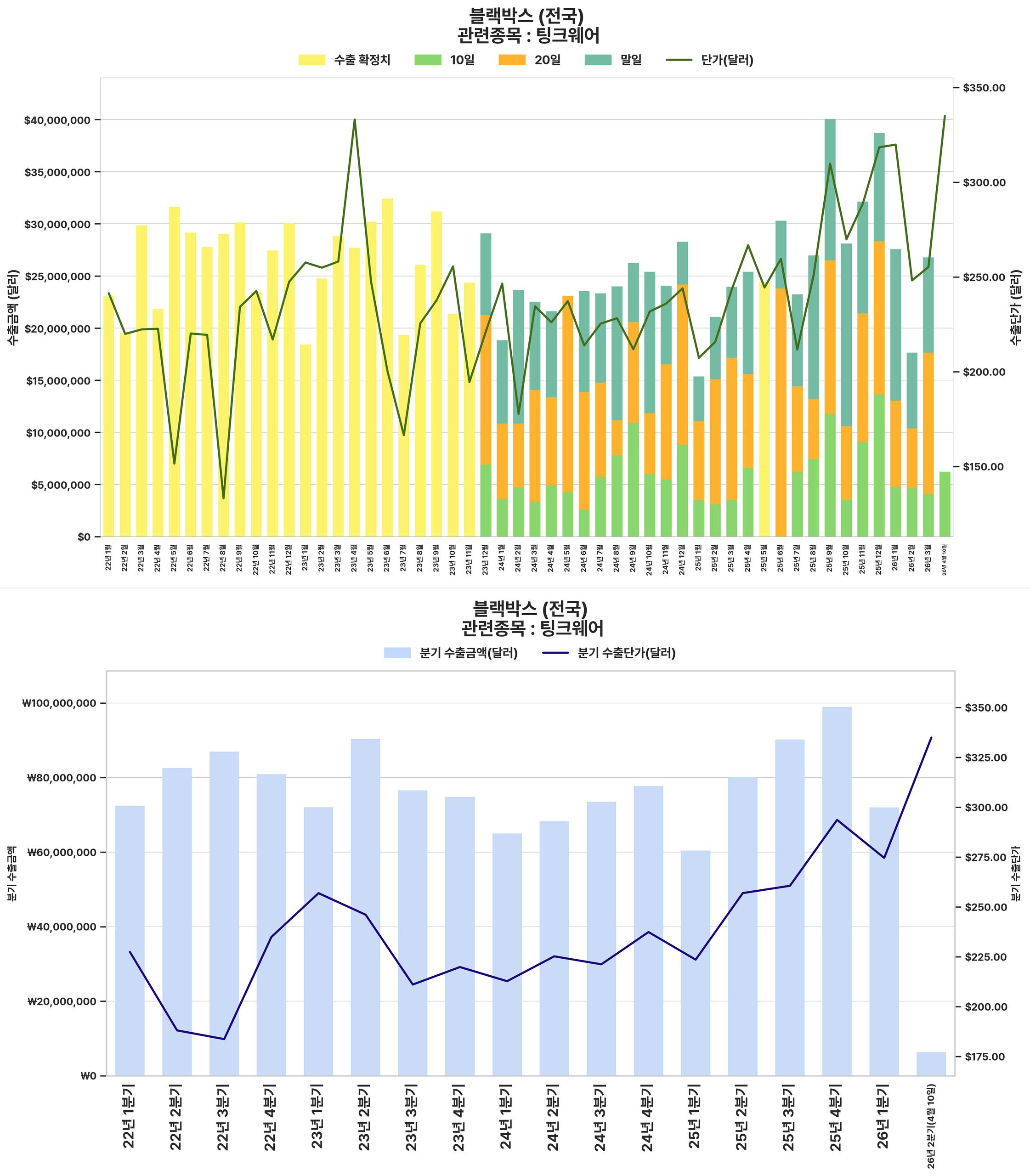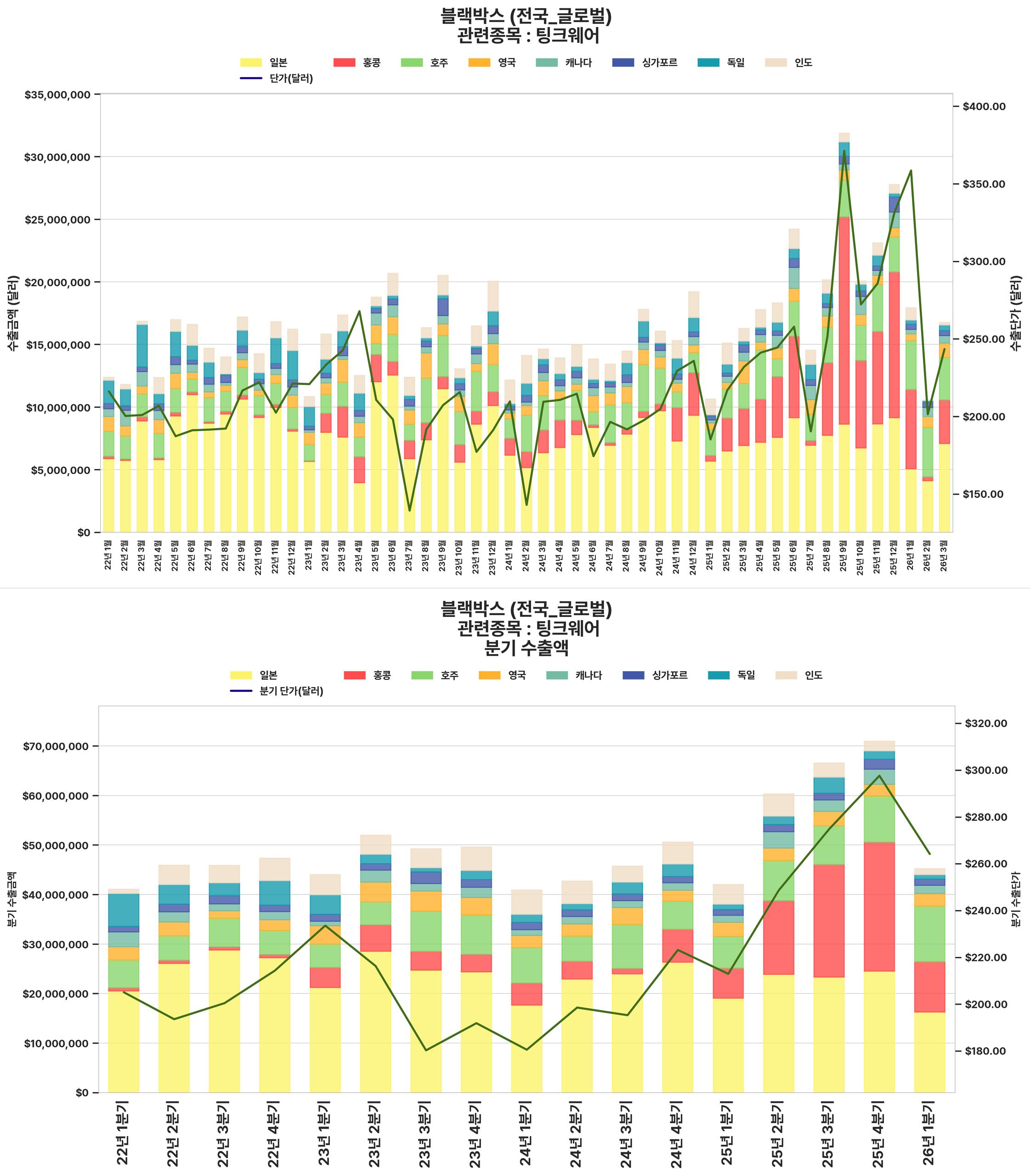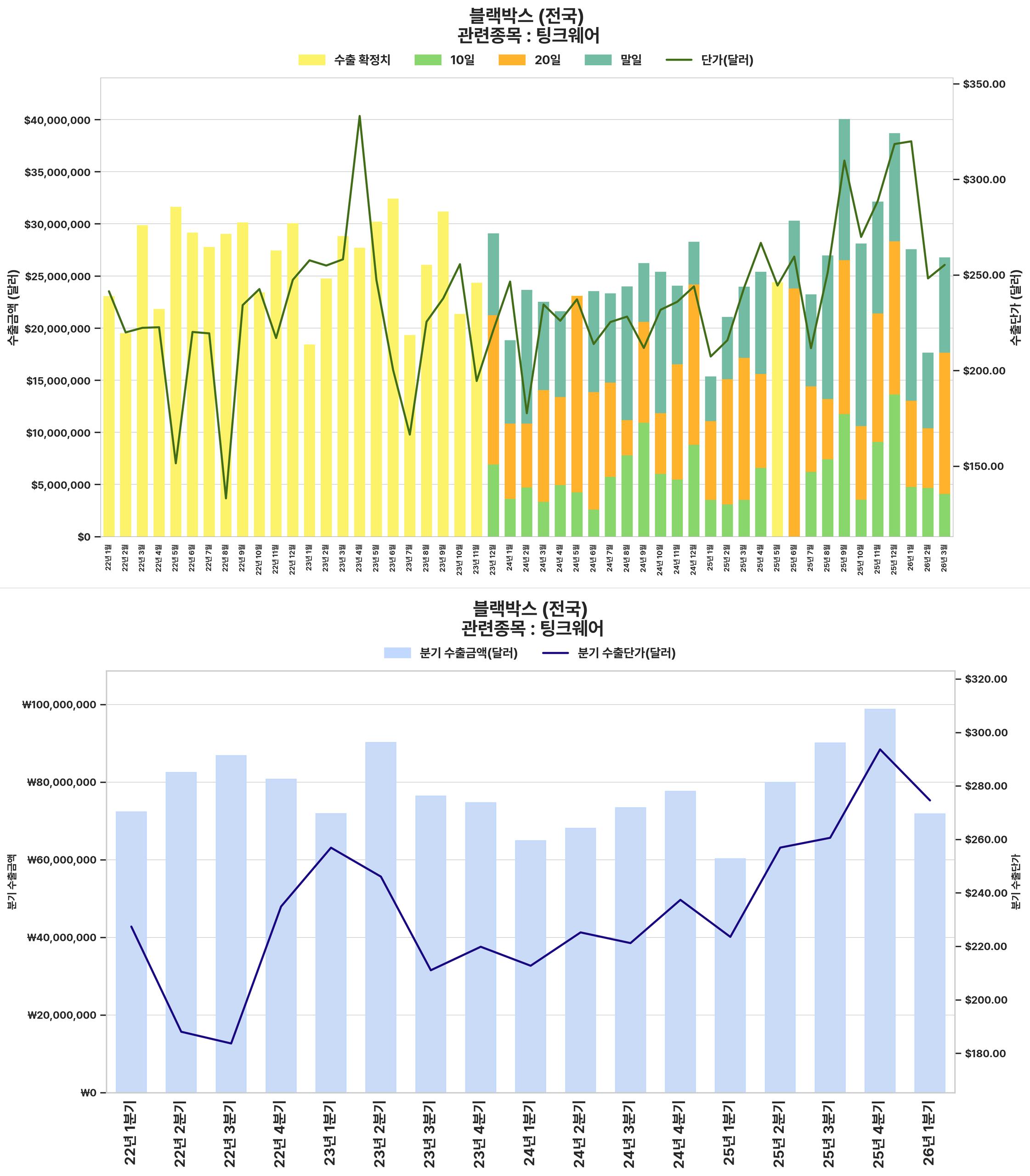 국내 블랙박스 수출 시장은 2025년 4분기에 견조한 실적을 기록했으나, 2026년 1분기에는 전 분기 대비 수출 규모와 단가가 하락할 것으로 전망되는 반면, 전년 동기 대비로는 성장세를 유지하며 혼조세를 보이고 있습니다.