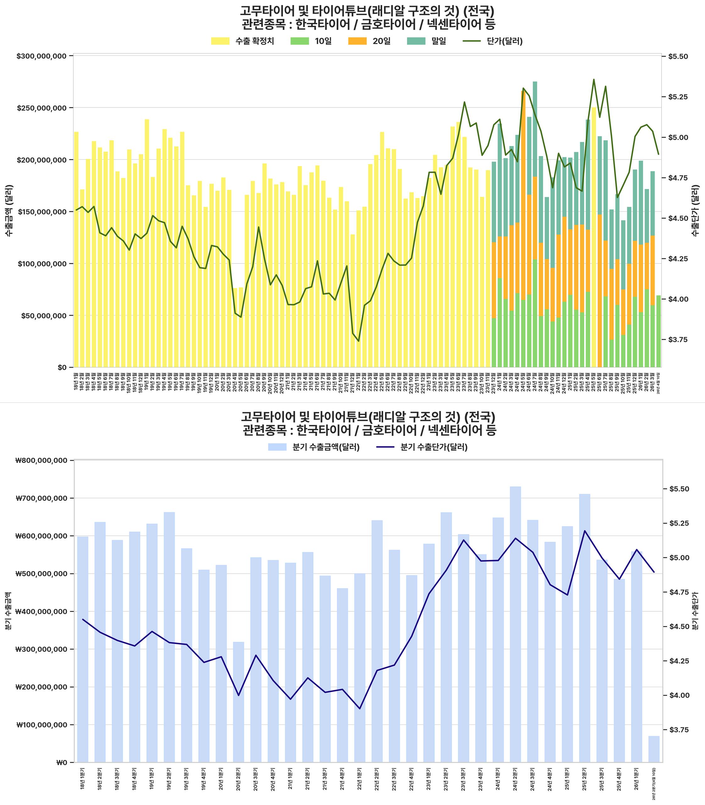 2026년 1분기 타이어 수출금액 및 단가가 전년 동기 대비 소폭 하락했으나 전분기 대비 반등하여 실적에 미치는 영향은 제한적일 것으로 보임. 다만 2분기 초반(4월 10일) 데이터는 다시 소폭 하락 추세를 보여 불확실성이 상존.