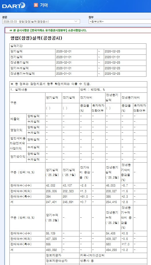 2월 총 판매대수가 전년 동기 대비 2.8% 감소하고, 연간 누계 판매대수도 0.2% 소폭 감소하여 매출 및 이익에 경미한 하방 압력으로 작용할 수 있음.