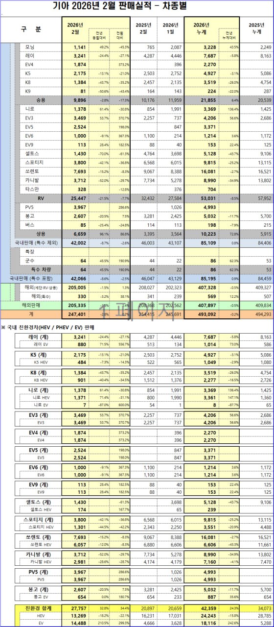 기아의 2월 판매량은 전년 동월 대비 소폭 감소했으나, 상용차와 전기차(EV) 부문에서 매우 높은 성장률을 기록하며 긍정적인 실적 개선 가능성을 시사합니다.
