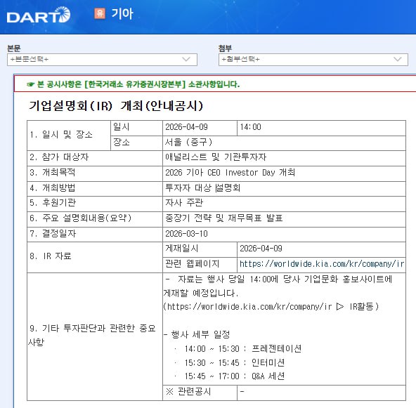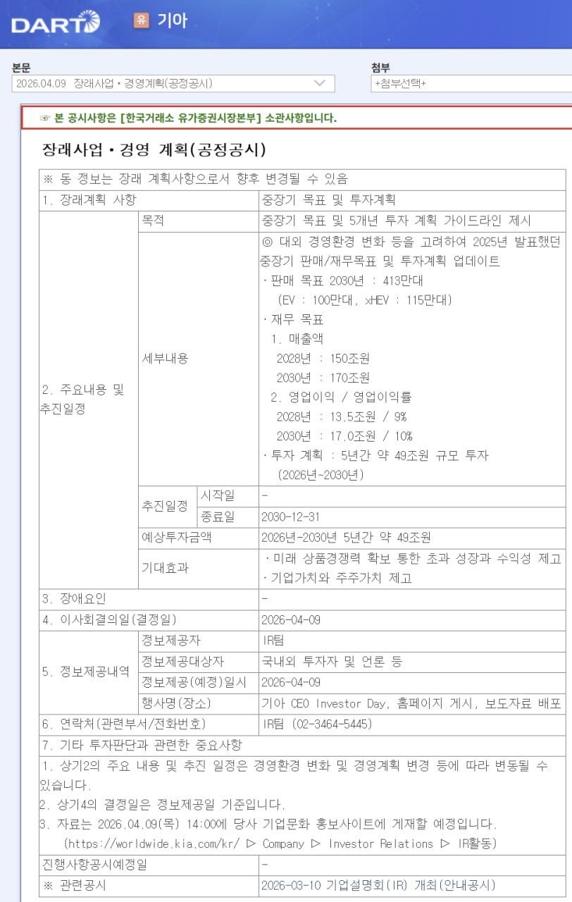 기아는 2026년 4월 9일 서울 중구에서 애널리스트 및 기관투자자를 대상으로 CEO Investor Day를 개최하여 중장기 전략과 재무목표를 발표할 예정입니다.