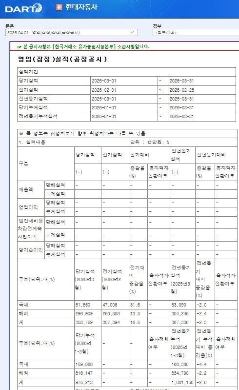 2026년 3월 자동차 판매 실적은 전월 대비 회복세를 보였으나, 전년 동기 대비 및 1분기 누계 실적은 소폭 감소하여 산업 전반의 성장세 둔화 우려가 제기될 수 있음.