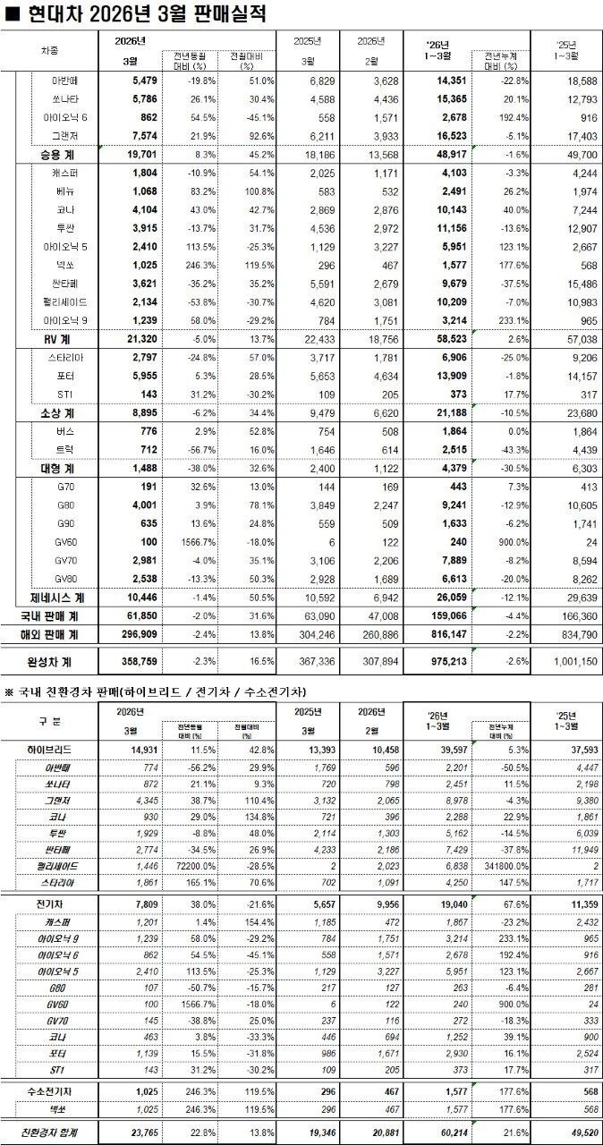 2026년 3월 현대차의 전반적인 판매량은 전년 동월 대비 소폭 감소했으나, 전월 대비 뚜렷한 회복세를 보였으며, 특히 국내 친환경차 판매가 견조한 성장세를 지속함.