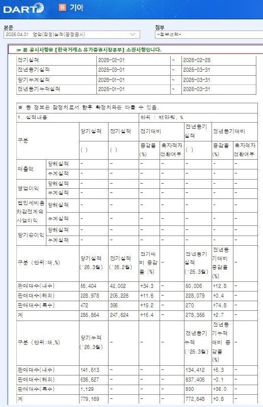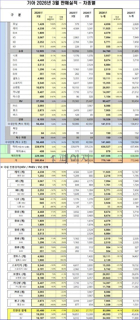 기아의 2026년 3월 판매 실적은 국내 시장의 견조한 성장과 친환경차 판매량의 가파른 증가에 힘입어 전반적인 성장세를 기록했으나, 해외 판매는 상대적으로 완만한 증가를 보였다.