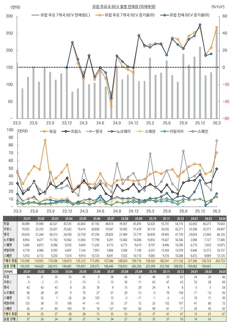 유럽 BEV 시장이 판매량 및 증가율 모두 가파른 회복세를 보이며 강력한 성장 국면에 진입했다.