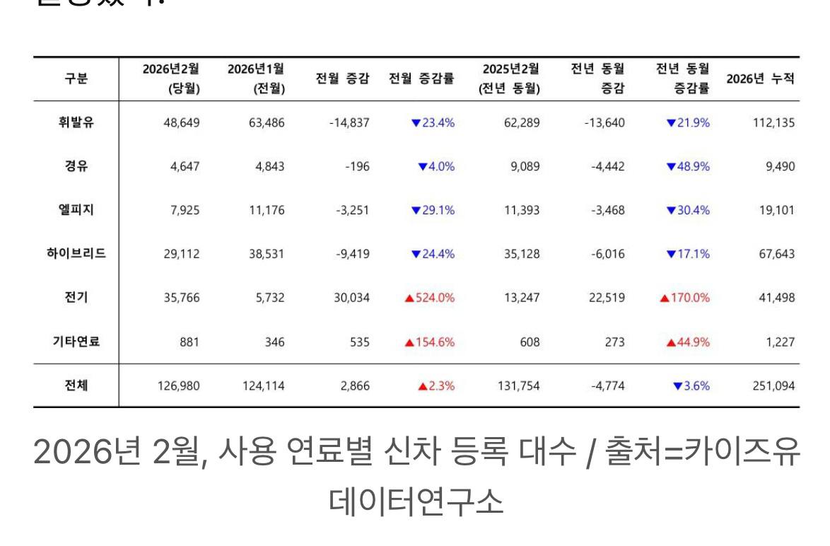 국내 신차 시장은 전년 동월 대비 감소세이나, 전기차 등록 대수는 전년 대비 170%, 전월 대비 524% 급증하며 시장 구조 변화가 가속화되고 있음.