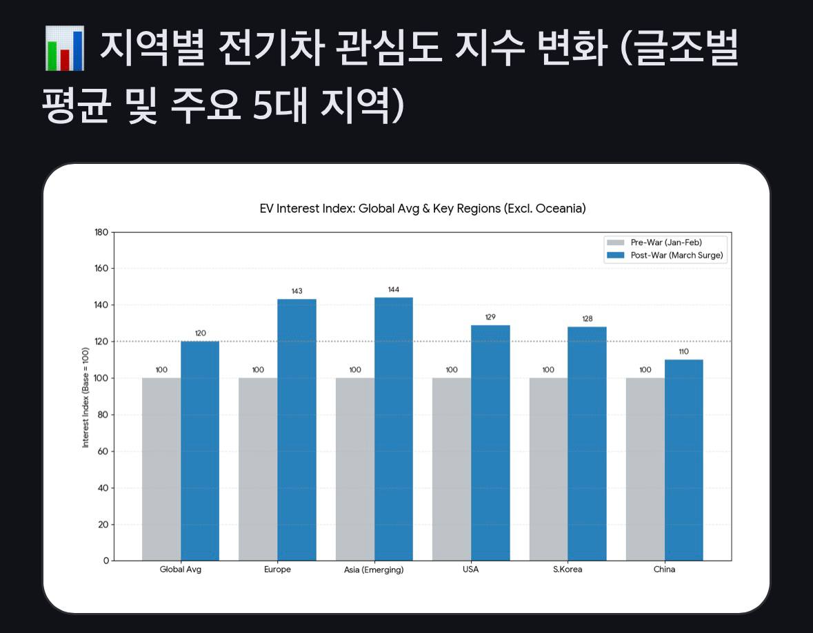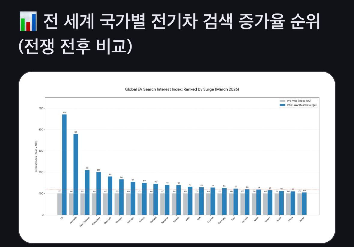 전쟁 이후(2026년 3월 기준) 전 세계적으로 전기차에 대한 검색 관심이 크게 증가했으며, 특히 영국과 호주에서 가장 높은 관심도 상승률을 보였다.