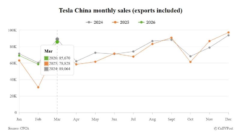 테슬라의 3월 중국 판매량은 전년 대비 증가했으나 2년 전 대비 감소하며 혼조세를 보였고, 전반적인 판매량은 2024년 수준에 미치지 못함.