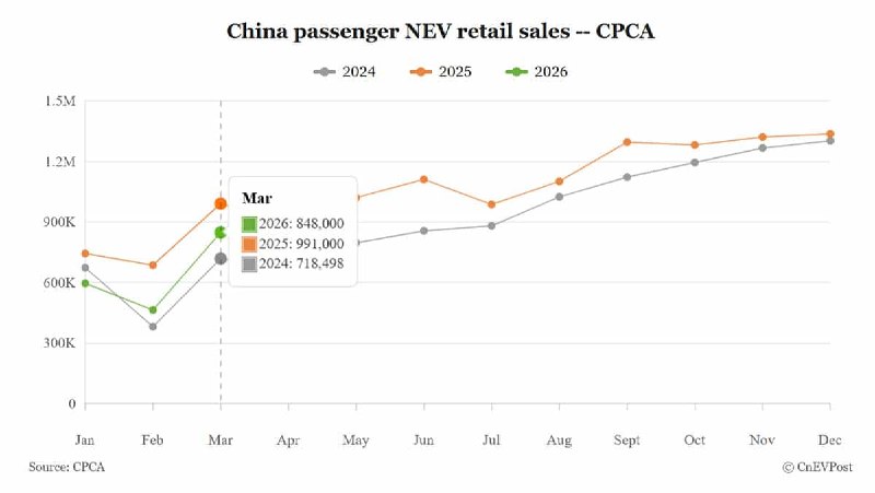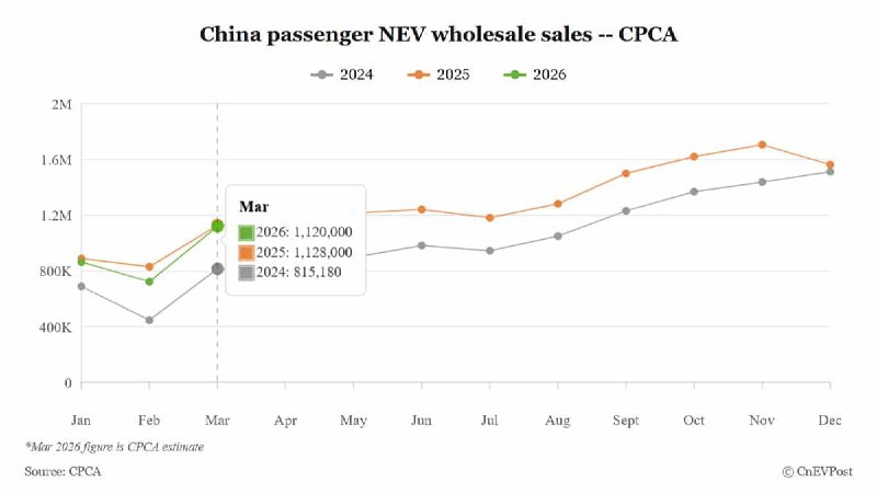 중국 승용 신에너지차(NEV) 도매 판매는 2024년부터 2026년까지 전반적인 성장세를 보일 것으로 예상되지만, 2026년 3월 판매량은 전년 동월 대비 소폭 감소할 것으로 추정된다.