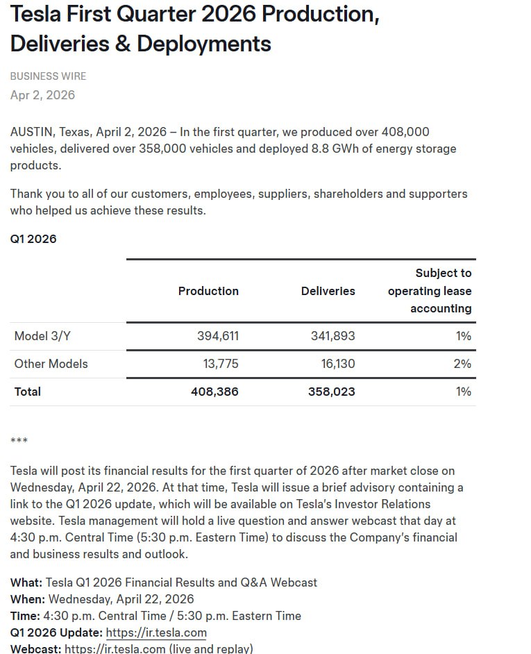 Tesla의 2026년 1분기 차량 생산 및 인도, 에너지 저장 장치 배포 실적 발표.