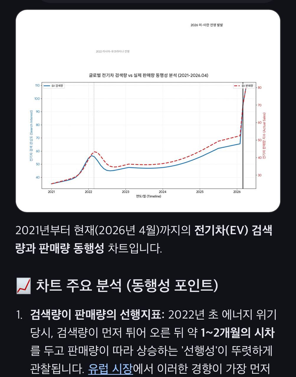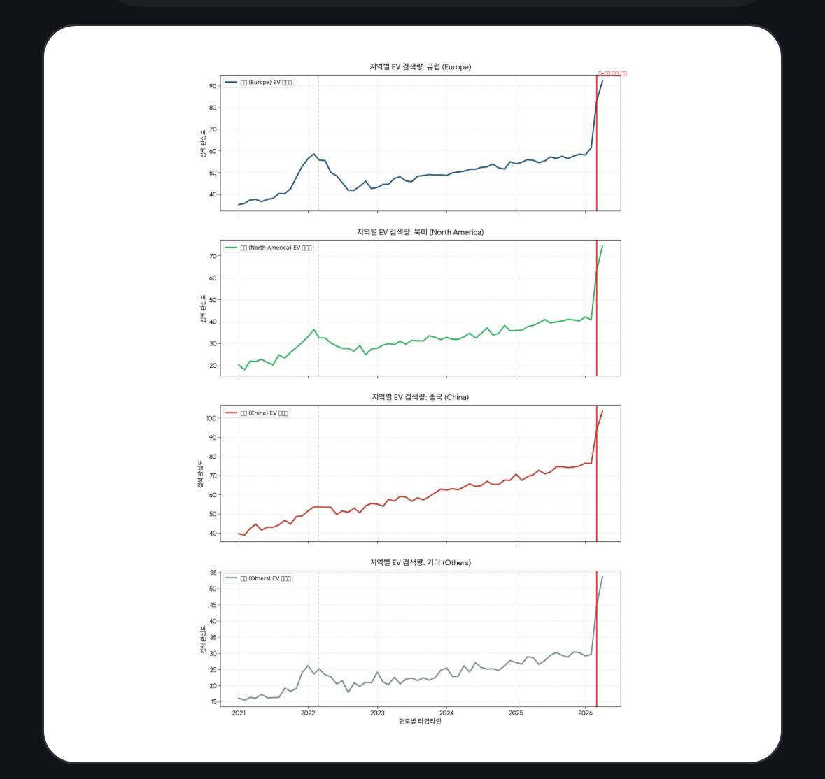 글로벌 전기차 검색량은 실제 판매량의 선행지표로, 1~2개월의 시차를 두고 판매량에 영향을 미치는 경향을 보이며, 2021년부터 2026년 4월까지 시장이 지속적으로 성장하고 최근 가파른 상승세를 보였다.