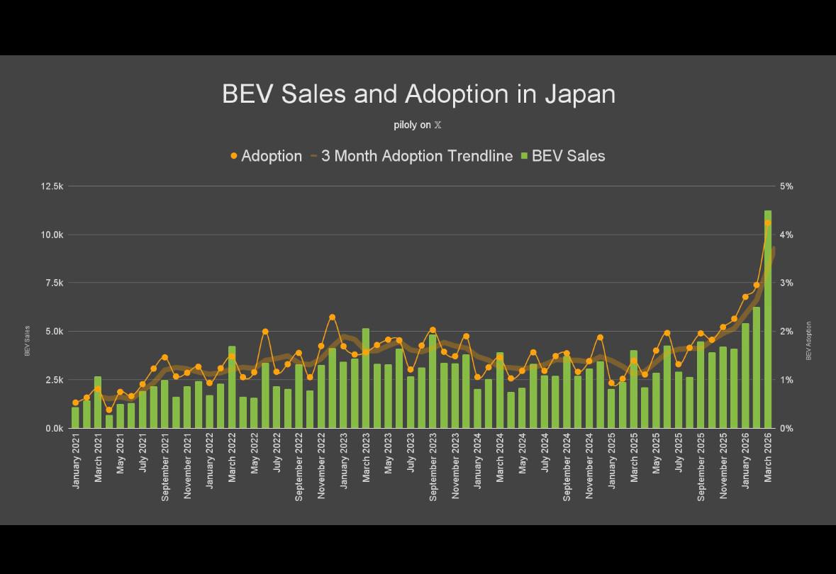 일본 내 전기차(BEV) 판매량 및 시장 채택률이 2021년 초부터 2026년 3월까지 약 5년간 가파른 성장세를 보이며, 전반적인 전기차 산업의 지속적인 확장을 예고함.